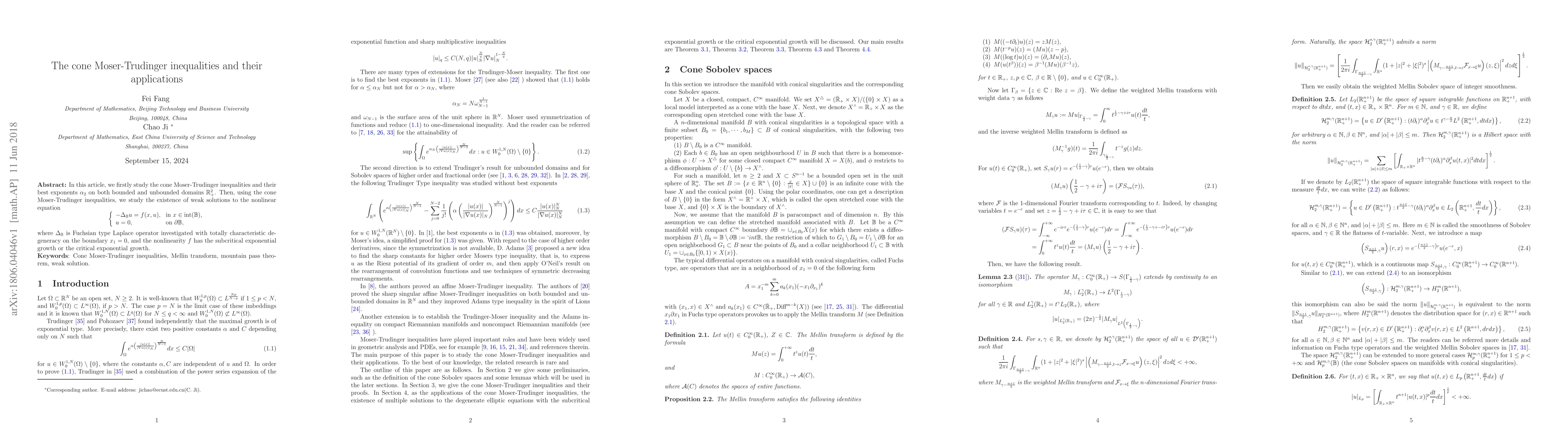 In this article, we firstly study the cone Moser-Trudinger inequalities and their best exponents $\alpha_2$ on both bounded and unbounded domains $\mathbb{R}^2_{+}$. Then, using the cone Moser-Trudinger inequalities, we study the existence of weak solutions to the nonlinear equation \begin{equation*} \left\{\begin{array}{ll} -\Delta_{\mathbb{B}} u=f(x, u), &\mbox{in}\ x\in \mbox{int} (\mathbb{B}), \\ u= 0, &\mbox{on}\ \partial\mathbb{B}, \end{array} \right. \end{equation*} where $\Delta_{\mathbb{B}}$ is Fuchsian type Laplace operator investigated with totally characteristic degeneracy on the boundary $x_1 =0$, and the nonlinearity $f$ has the subcritical exponential growth or the critical exponential growth.