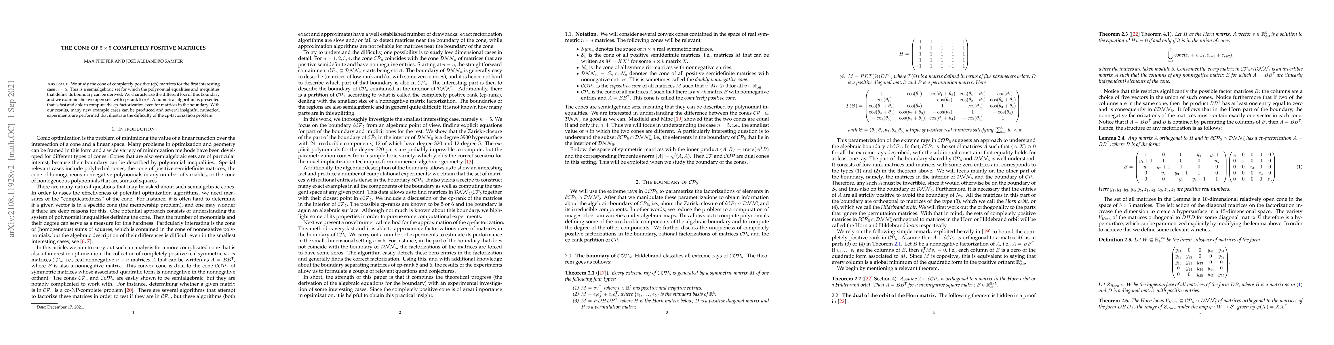 We study the cone of completely positive (cp) matrices for the first interesting case $n = 5$. This is a semialgebraic set, which means that the polynomial equalities and inequlities that define its boundary can be derived. We characterize the different loci of this boundary and we examine the two open sets with cp-rank 5 or 6. A numerical algorithm is presented that is fast and able to compute the cp-factorization even for matrices in the boundary. With our results, many new example cases can be produced and several insightful numerical experiments are performed that illustrate the difficulty of the cp-factorization problem.