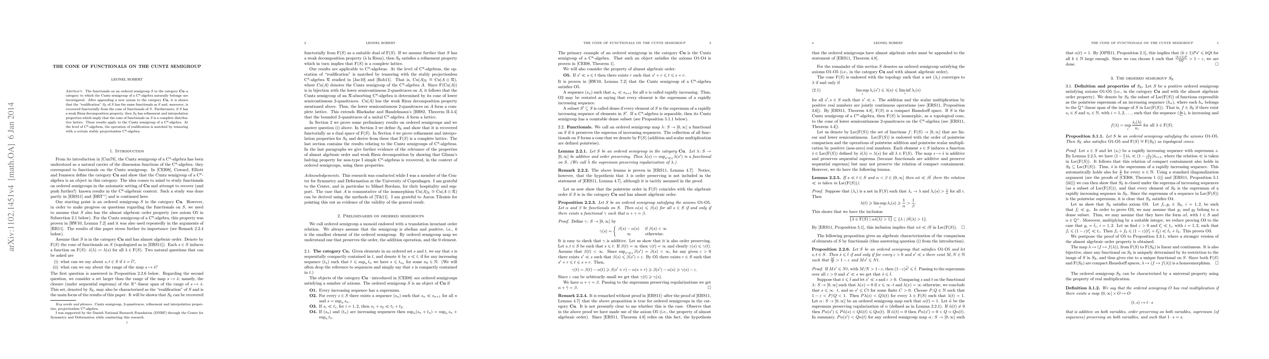 This paper investigates functionals on the Cuntz semigroup within the category Cu, showing that appending a new axiom allows the realification of S to recover S functorially and maintain the same functionals. If S has a weak Riesz decomposition, S_R gains refinement and interpolation properties, making the cone of functionals on S a complete distributive lattice. These findings extend to the Cuntz semigroup of C*-algebras, where realification corresponds to tensoring with a specific stably projectionless C*-algebra.