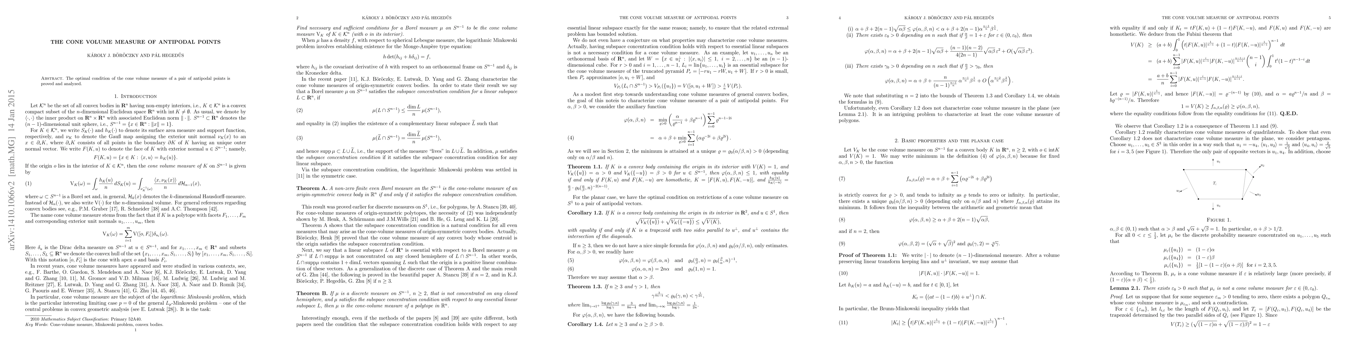 The optimal condition of the cone volume measure of a pair of antopodal points is proved and analyzed.