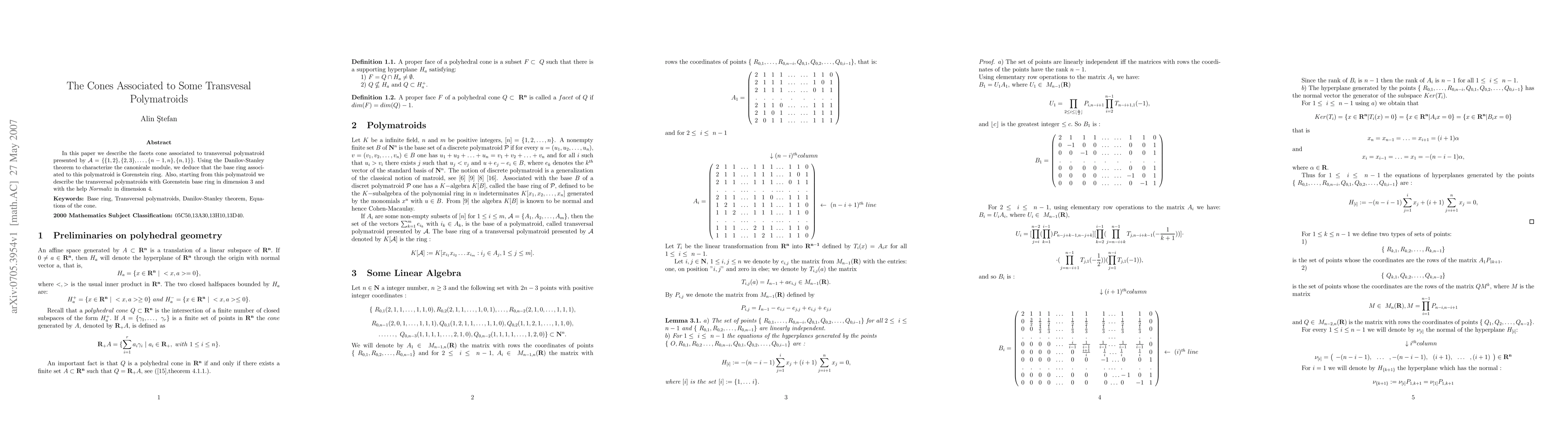 In this paper we describe the facets cone associated to transversal polymatroid presented by $\mathcal{A} = \{\{1,2\},\{2,3\},...,\{n-1,n\},\{n,1\}\}.$ Using the Danilov-Stanley theorem to characterize the canonicale module, we deduce that the base ring associated to this polymatroid is Gorenstein ring. Also, starting from this polymatroid we describe the transversal polymatroids with Gorenstein base ring in dimension 3 and with the help $\it Normaliz$ in dimension 4.