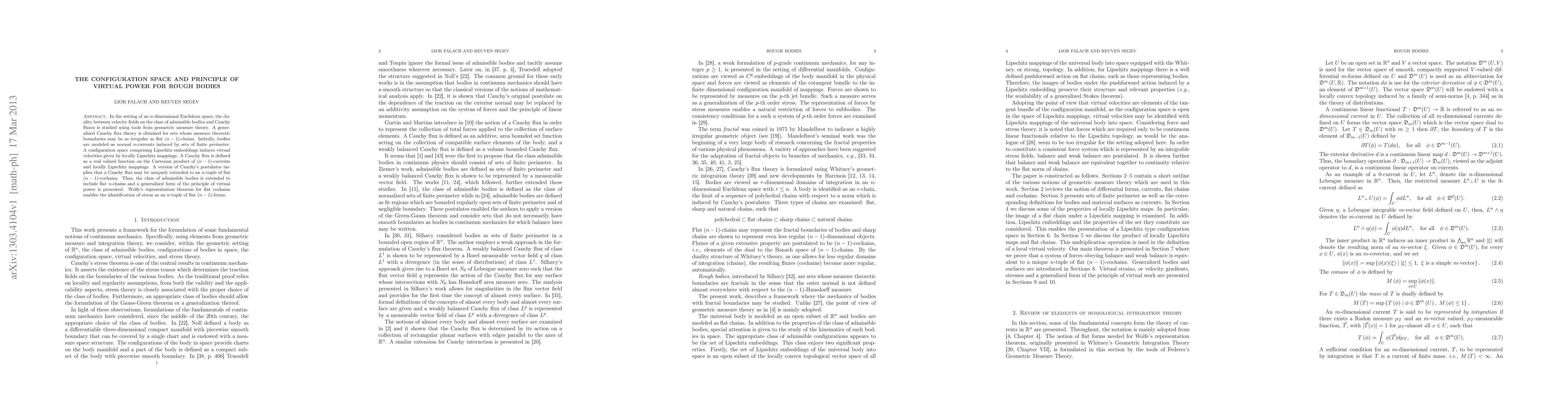 In the setting of an $n$-dimensional Euclidean space, the duality between velocity fields on the class of admissible bodies and Cauchy fluxes is studied using tools from geometric measure theory. A generalized Cauchy flux theory is obtained for sets whose measure theoretic boundaries may be as irregular as flat $(n-1)$-chains. Initially, bodies are modeled as normal $n$-currents induced by sets of finite perimeter. A configuration space comprising Lipschitz embeddings induces virtual velocities given by locally Lipschitz mappings. A Cauchy flux is defined as a real valued function on the Cartesian product of $(n-1)$-currents and locally Lipschitz mappings. A version of Cauchy's postulates implies that a Cauchy flux may be uniquely extended to an $n$-tuple of flat $(n-1)$-cochains. Thus, the class of admissible bodies is extended to include flat $n$-chains and a generalized form of the principle of virtual power is presented. Wolfe's representation theorem for flat cochains enables the identification of stress as an $n$-tuple of flat $(n-1)$-forms.
