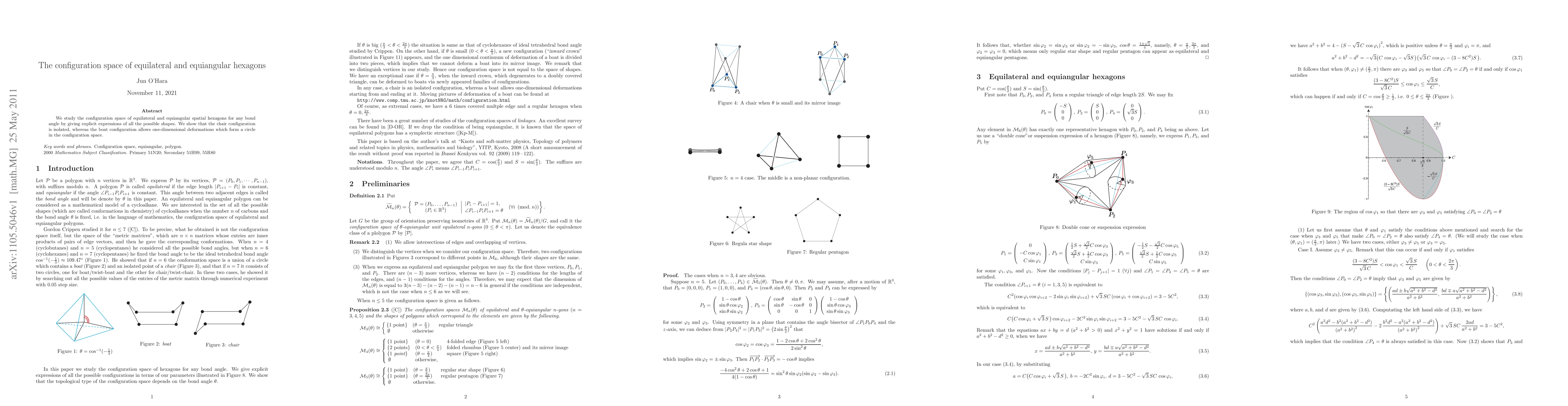 This paper explores the configuration space of equilateral and equiangular hexagons, providing explicit expressions for all possible shapes. It finds that the chair configuration is unique, while the boat configuration allows for continuous deformations forming a circular path in the configuration space.