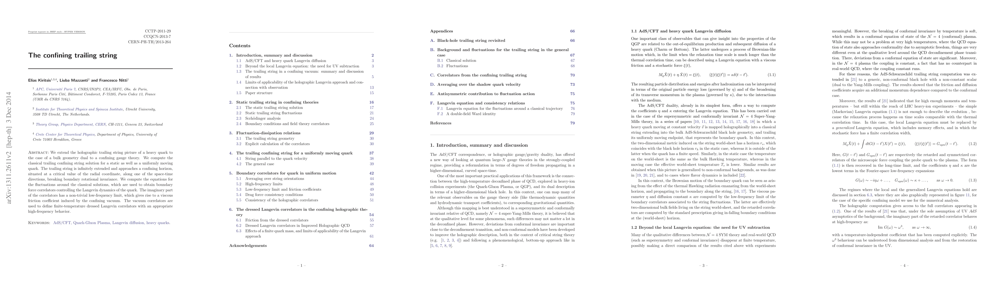 This paper extends the holographic trailing string concept for heavy quarks in a confining gauge theory, deriving classical solutions for static and moving quarks. It explores fluctuations and boundary force correlators that determine the quark's Langevin dynamics, revealing a viscous friction coefficient from vacuum correlators at low frequencies.