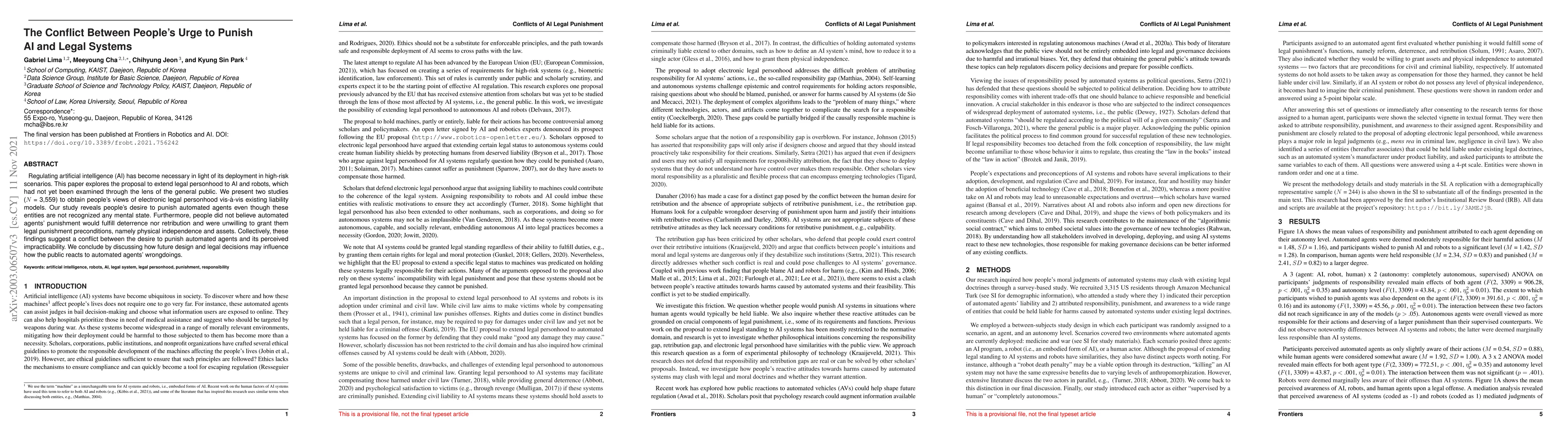 Regulating artificial intelligence (AI) has become necessary in light of its deployment in high-risk scenarios. This paper explores the proposal to extend legal personhood to AI and robots, which had not yet been examined through the lens of the general public. We present two studies (N = 3,559) to obtain people's views of electronic legal personhood vis-\`a-vis existing liability models. Our study reveals people's desire to punish automated agents even though these entities are not recognized any mental state. Furthermore, people did not believe automated agents' punishment would fulfill deterrence nor retribution and were unwilling to grant them legal punishment preconditions, namely physical independence and assets. Collectively, these findings suggest a conflict between the desire to punish automated agents and its perceived impracticability. We conclude by discussing how future design and legal decisions may influence how the public reacts to automated agents' wrongdoings.