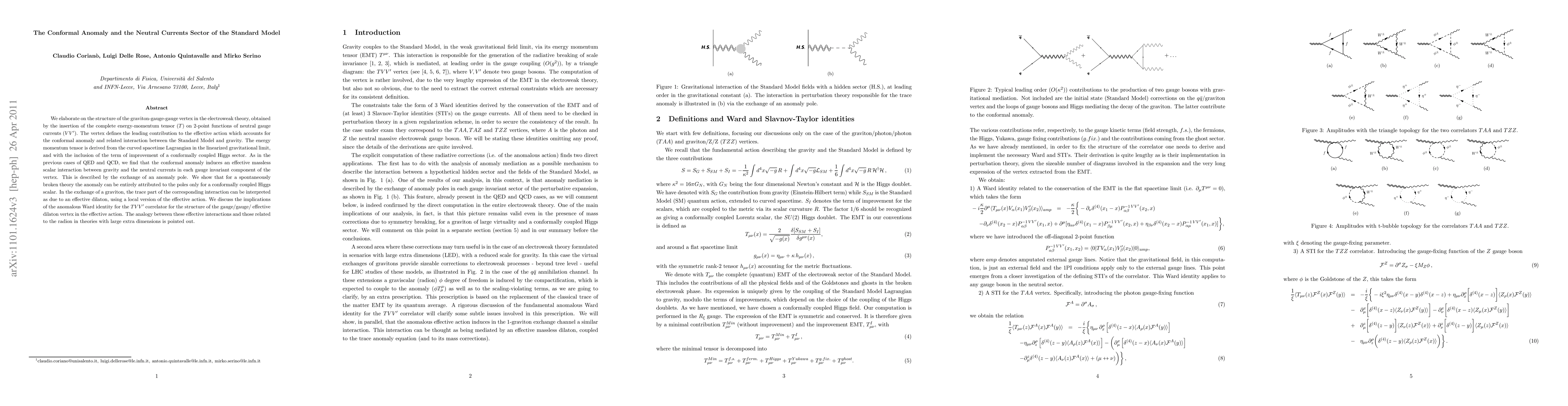 This paper investigates the graviton-gauge-gauge vertex in the electroweak theory, revealing the leading contribution to the effective action that accounts for the conformal anomaly. It finds that the conformal anomaly induces an effective massless scalar interaction between gravity and neutral currents, analogous to QED and QCD.