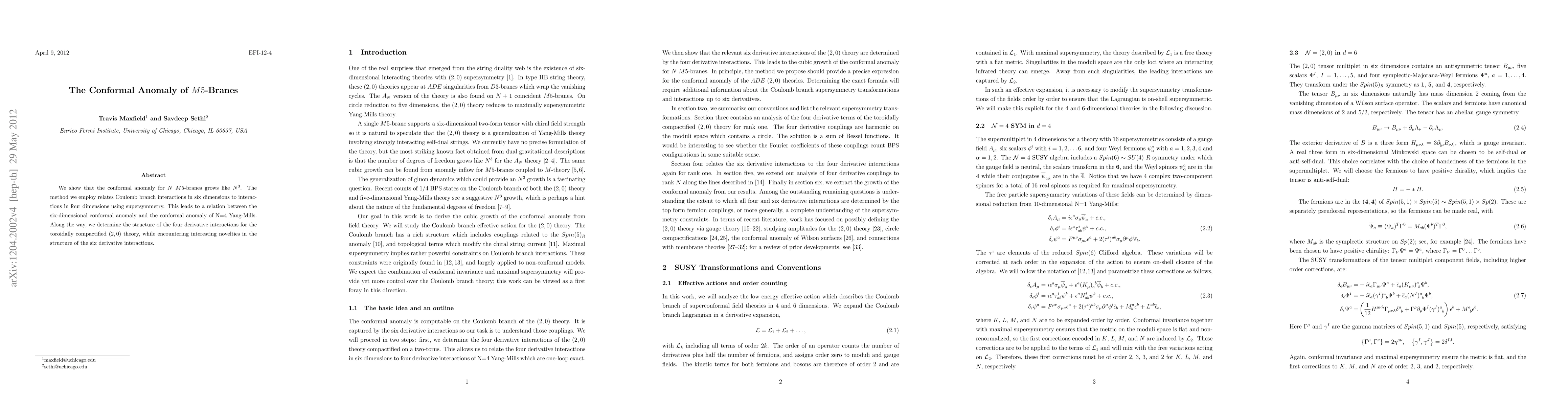 We show that the conformal anomaly for N M5-branes grows like $N^3$. The method we employ relates Coulomb branch interactions in six dimensions to interactions in four dimensions using supersymmetry. This leads to a relation between the six-dimensional conformal anomaly and the conformal anomaly of N=4 Yang-Mills. Along the way, we determine the structure of the four derivative interactions for the toroidally compactified (2,0) theory, while encountering interesting novelties in the structure of the six derivative interactions.