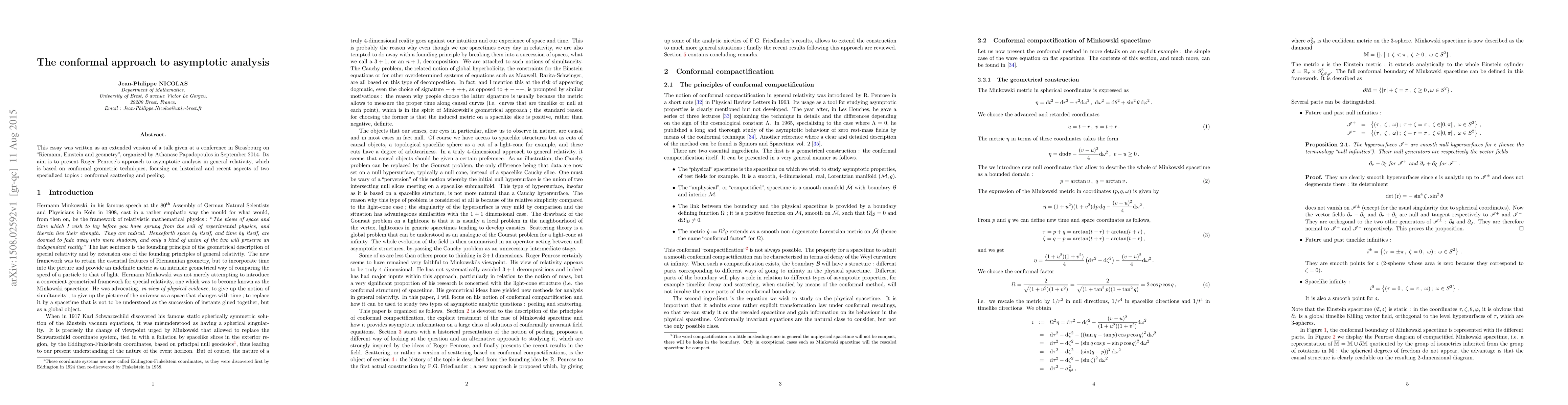 This essay was written as an extended version of a talk given at a conference in Strasbourg on "Riemann, Einstein and geometry", organized by Athanase Papadopoulos in September 2014. Its aim is to present Roger Penrose's approach to asymptotic analysis in general relativity, which is based on conformal geometric techniques, focusing on historical and recent aspects of two specialized topics~: conformal scattering and peeling.