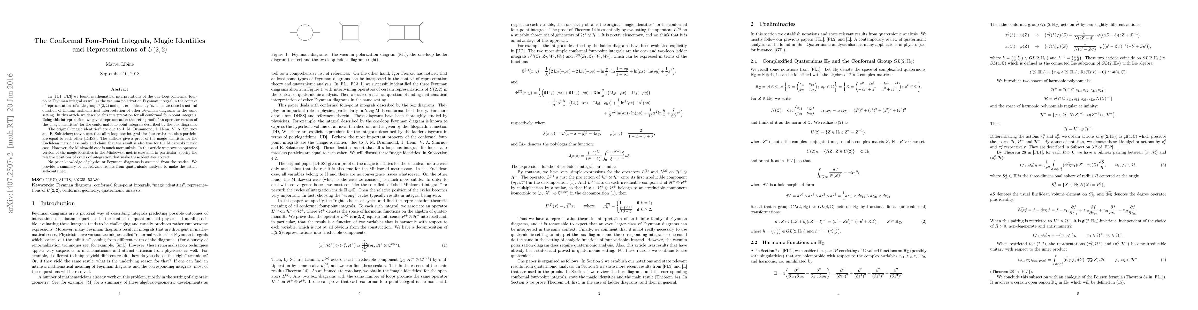 In [FL1, FL3] we found mathematical interpretations of the one-loop conformal four-point Feynman integral as well as the vacuum polarization Feynman integral in the context of representations of a Lie group U(2,2) and quaternionic analysis. Then we raised a natural question of finding mathematical interpretation of other Feynman diagrams in the same setting. In this article we describe this interpretation for all conformal four-point integrals. Using this interpretation, we give a representation-theoretic proof of an operator version of the "magic identities" for the conformal four-point integrals described by the box diagrams. The original "magic identities" are due to J.M.Drummond, J.Henn, V.A.Smirnov and E.Sokatchev, they assert that all n-loop box integrals for four scalar massless particles are equal to each other [DHSS]. The authors give a proof of the magic identities for the Euclidean metric case only and claim that the result is also true for the Minkowski metric case. However, the Minkowski case is much more subtle. In this article we prove an operator version of the magic identities in the Minkowski metric case and, in particular, specify the relative positions of cycles of integration that make these identities correct. No prior knowledge of physics or Feynman diagrams is assumed from the reader. We provide a summary of all relevant results from quaternionic analysis to make the article self-contained.