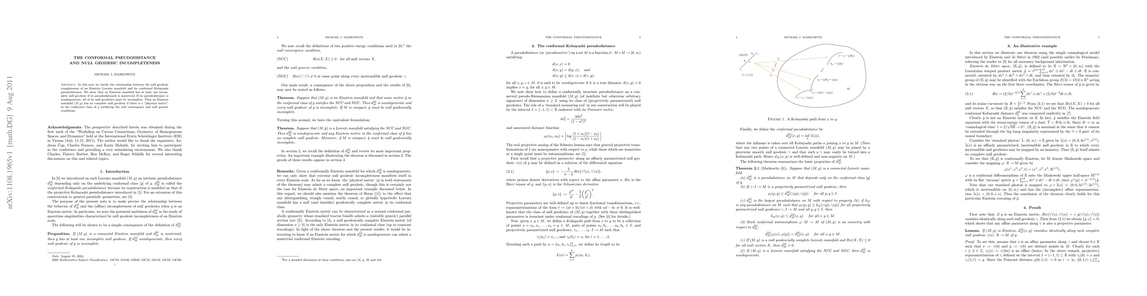 This paper establishes a connection between the null geodesic completeness of Einstein Lorentz manifolds and their conformal pseudodistance, demonstrating that nontrivial pseudodistances imply at least one incomplete null geodesic, and nondegenerate pseudodistances necessitate all null geodesics being incomplete.
