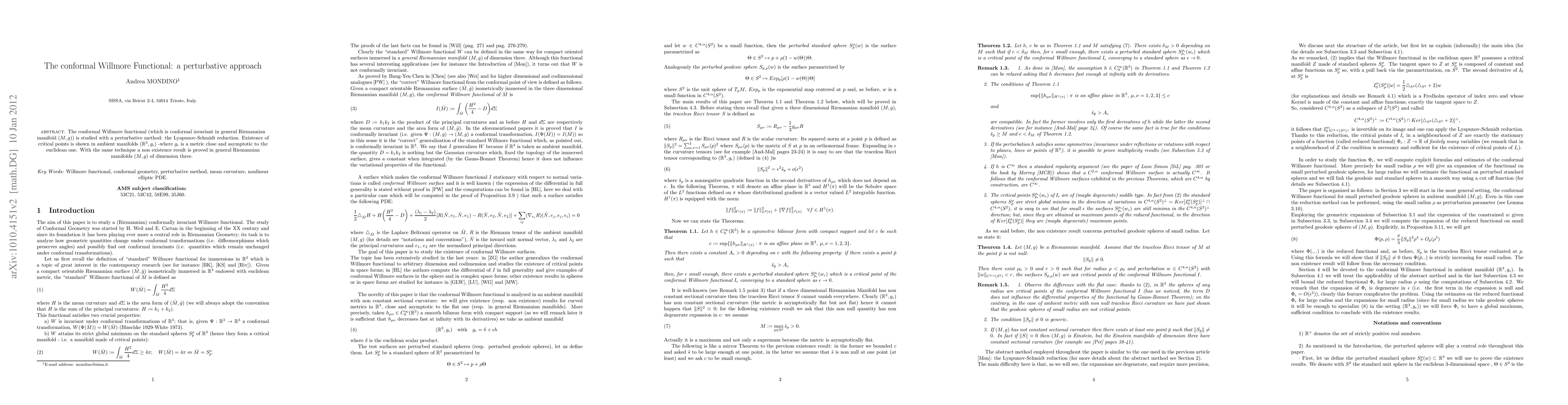 This paper explores the conformal Willmore functional using a perturbative Lyapunov-Schmidt reduction method, demonstrating the existence of critical points in ambient manifolds close to Euclidean space, while proving non-existence in general three-dimensional Riemannian manifolds.