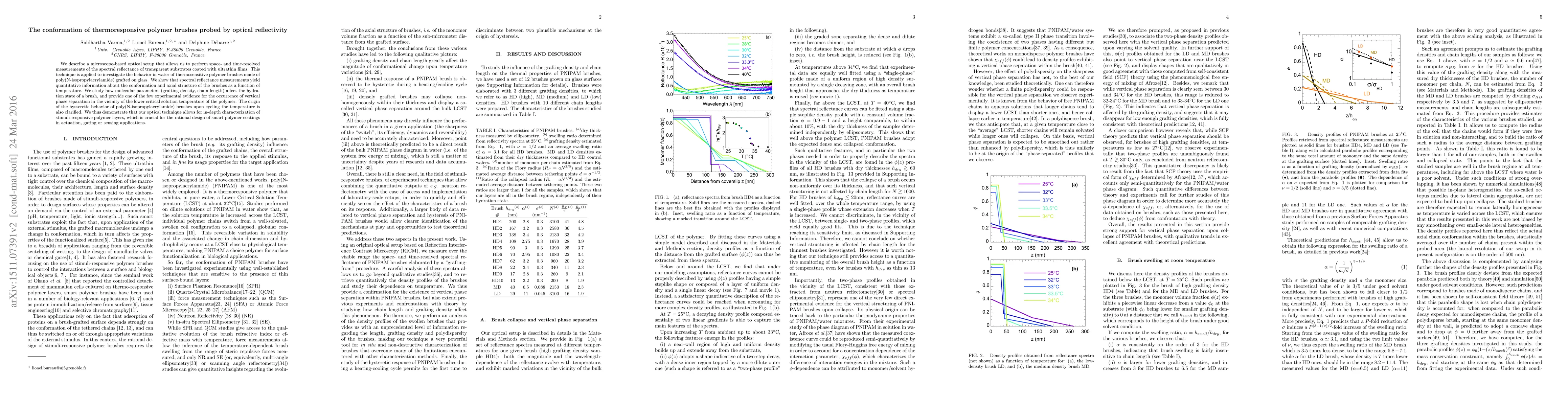 This study uses a microscope-based optical setup to measure the spectral reflectance of thermoresponsive polymer brushes, revealing their conformational changes and axial structure with temperature. The research highlights the impact of molecular parameters on brush hydration and identifies vertical phase separation near the polymer's lower critical solution temperature, providing insights into the hysteretic behavior of these smart polymer coatings.