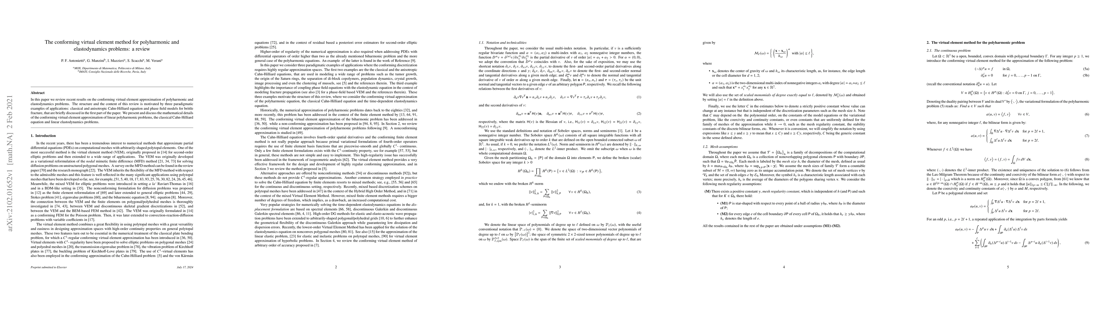 This paper reviews the conforming virtual element method for solving polyharmonic and elastodynamics problems, focusing on its application to the Cahn-Hilliard equation and phase field models for brittle fracture. The paper discusses the mathematical framework and details of the method for linear problems.