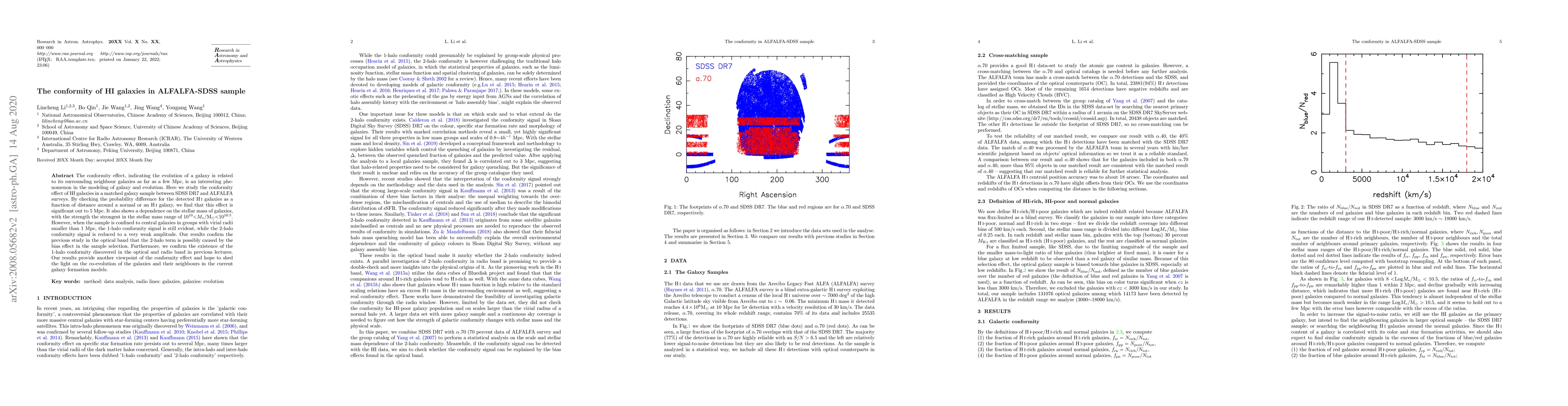 The conformity effect, indicating the evolution of a galaxy is related to its surrounding neighbour galaxies as far as a few Mpc, is an interesting phenomenon in the modeling of galaxy and evolution. Here we study the conformity effect of HI galaxies in a matched galaxy sample between SDSS DR7 and ALFALFA surveys. By checking the probability difference for the detected HI galaxies as a function of distance around a normal or an HI galaxy, we find that this effect is significant out to 5 Mpc. It also shows a dependence on the stellar mass of galaxies, with the strength the strongest in the stellar mass range of 10^10~10^10.5. However, when the sample is confined to central galaxies in groups with virial radii smaller than 1 Mpc, the 1-halo conformity signal is still evident, while the 2-halo conformity signal is reduced to a very weak amplitude. Our results confirm the previous study in the optical band that the 2-halo term is possibly caused by the bias effect in the sample selection. Furthermore, we confirm the existence of the 1-halo conformity discovered in the optical and radio band in previous lectures. Our results provide another viewpoint of the conformity effect and hope to shed the light on the co-evolution of the galaxies and their neighbours in the current galaxy formation models.