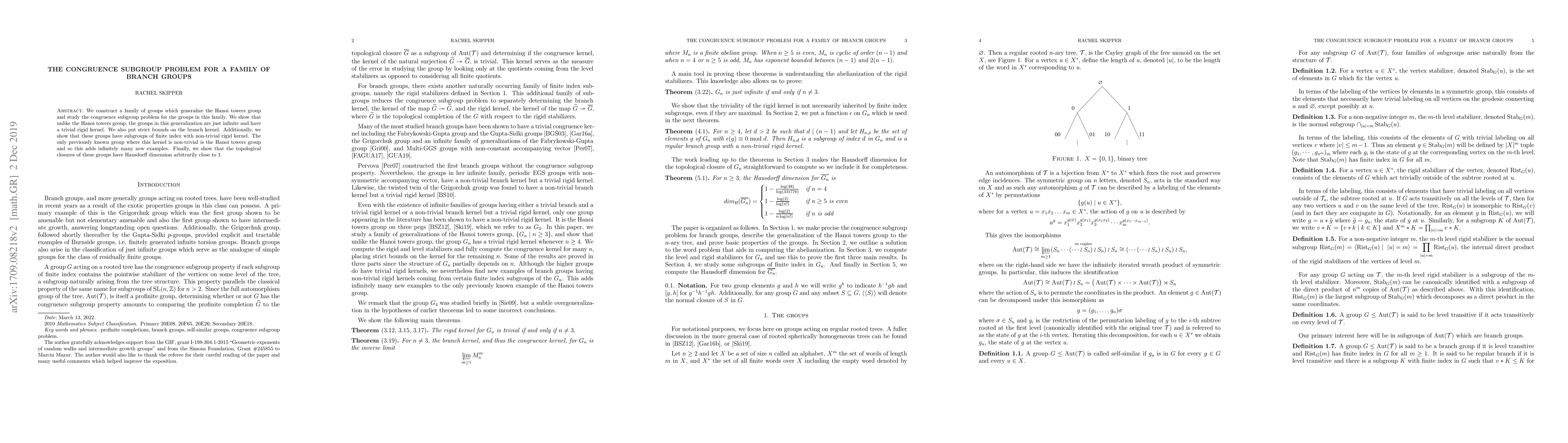 We construct a family of groups which generalize the Hanoi towers group and study the congruence subgroup problem for the groups in this family. We show that unlike the Hanoi towers group, the groups in this generalization are just infinite and have trivial rigid kernel. We also put strict bounds on the branch kernel. Additionally, we show that these groups have subgroups of finite index with non-trivial rigid kernel. The only previously known group where this kernel is non-trivial is the Hanoi towers group and so this adds infinitely many new examples. Finally, we show that the topological closures of these groups have Hausdorff dimension arbitrarily close to 1.