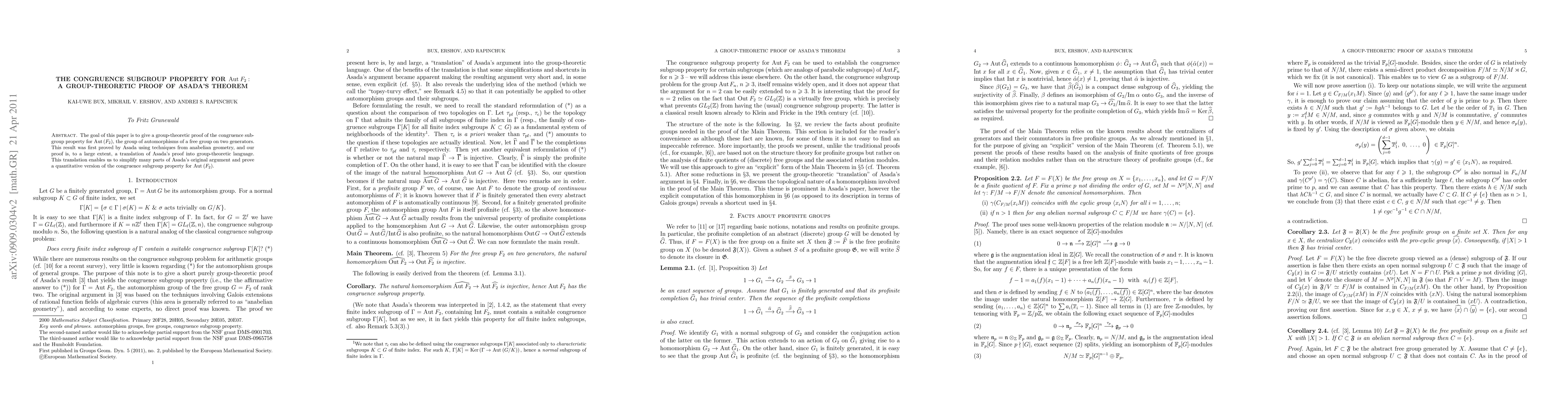 This paper provides a group-theoretic proof of the congruence subgroup property for $Aut(F_2)$, simplifying Asada's original proof from anabelian geometry and yielding a quantitative version of the result.