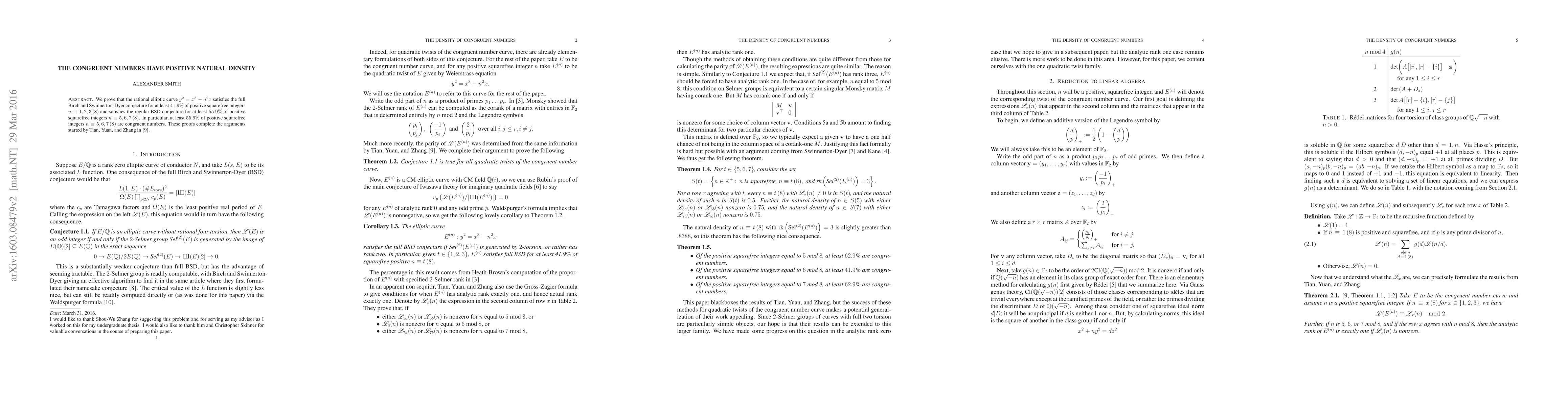 A study proves that 55.9% of positive squarefree integers n equal to 5, 6, or 7 mod 8 are congruent numbers, satisfying the regular BSD conjecture.