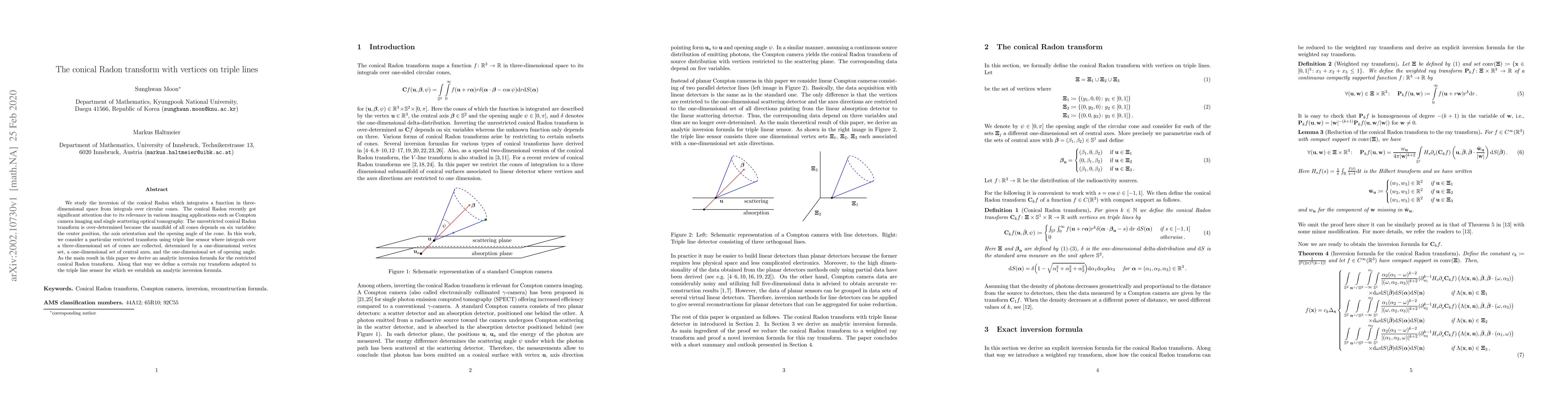 This paper investigates the inversion of the conical Radon transform, which integrates functions in three-dimensional space using circular cones, focusing on its application in imaging technologies. The authors derive an analytic inversion formula for a restricted version of the transform using triple line sensors, establishing an inversion formula for a related ray transform.