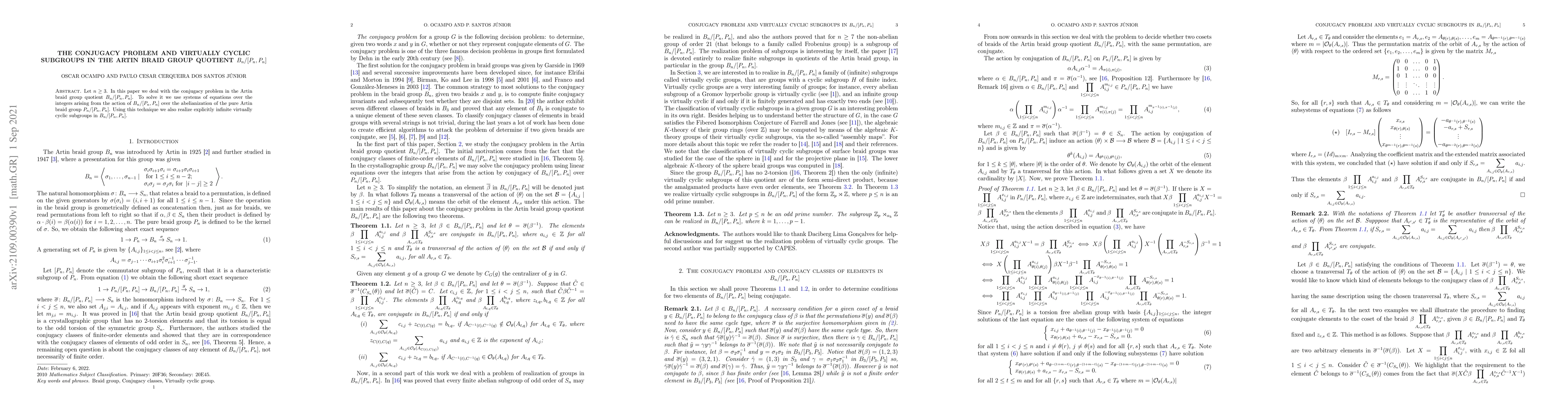 This paper addresses the conjugacy problem in the quotient $B_n/[P_n,P_n]$ of the Artin braid group, employing systems of integer equations derived from its action. It also explicitly constructs infinite virtually cyclic subgroups within this quotient.