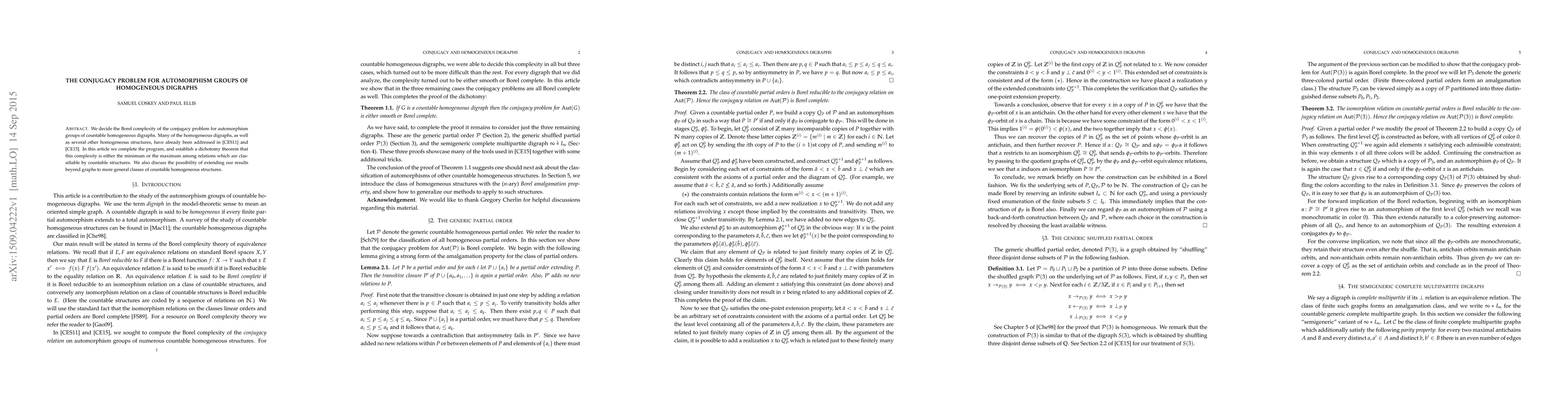 This paper resolves the Borel complexity of the conjugacy problem for automorphism groups of countable homogeneous digraphs, establishing a dichotomy theorem that places this complexity either at the minimum or maximum among classifiable relations by countable structures, and explores extending these results to broader homogeneous structures.
