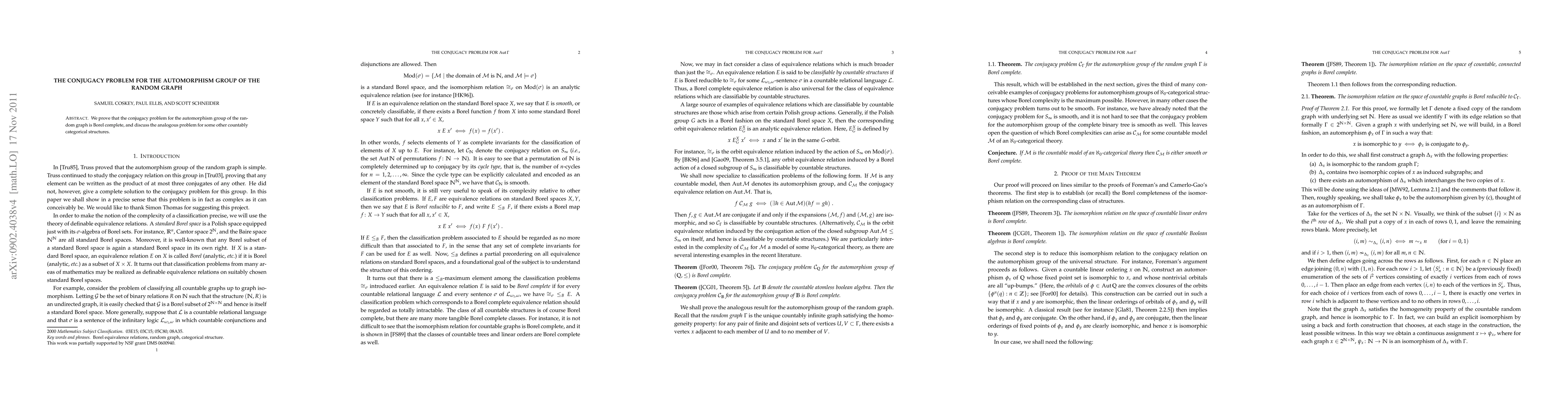 Summary: The paper establishes that the conjugacy problem for the automorphism group of the random graph is Borel complete. It also explores similar problems within other countably categorical structures.