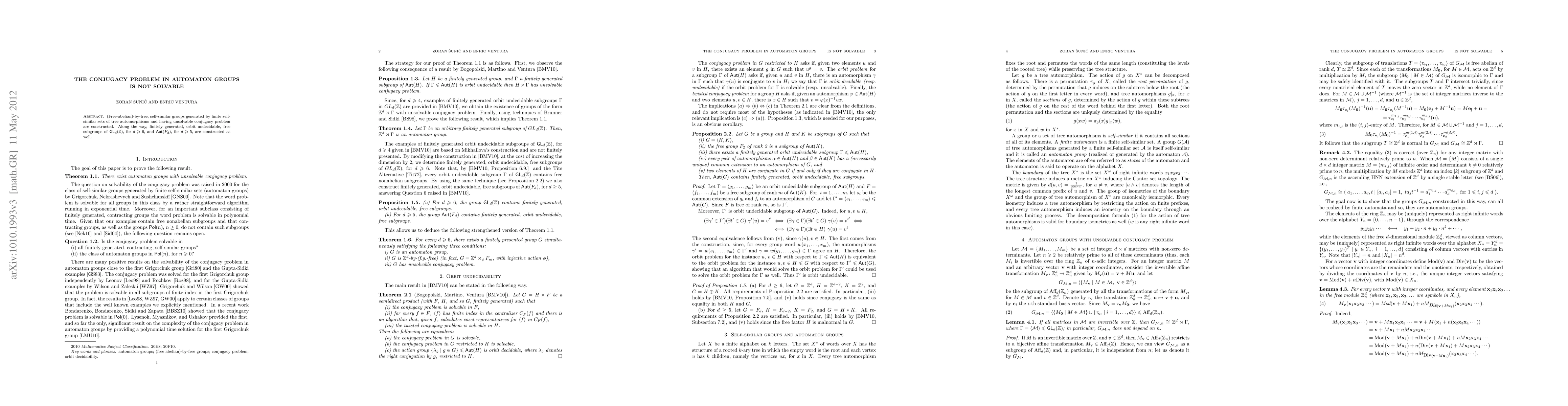 (Free-abelian)-by-free, self-similar groups generated by finite self-similar sets of tree automorphisms and having unsolvable conjugacy problem are constructed. Along the way, orbit undecidable, free subgroups of GL_d(Z), for d > 5, and Aut(F_d), for d > 4, are constructed as well.