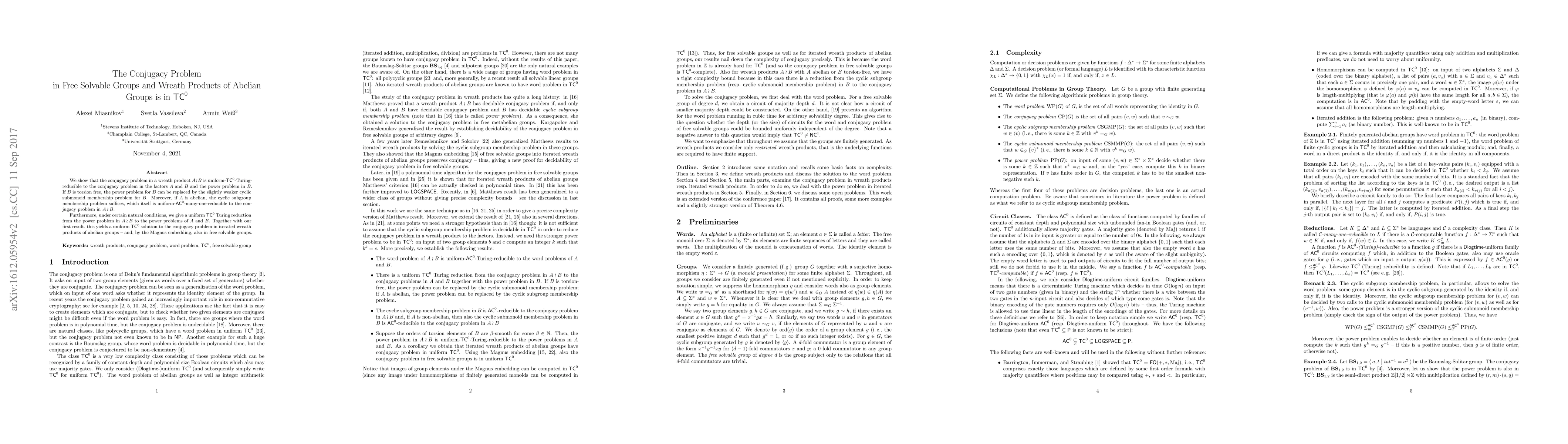 This paper demonstrates a uniform $\mathsf{TC}^0$ Turing reduction for solving the conjugacy problem in wreath products of abelian groups, which extends to free solvable groups. The reduction leverages the conjugacy and power problems in the factors of the wreath product.