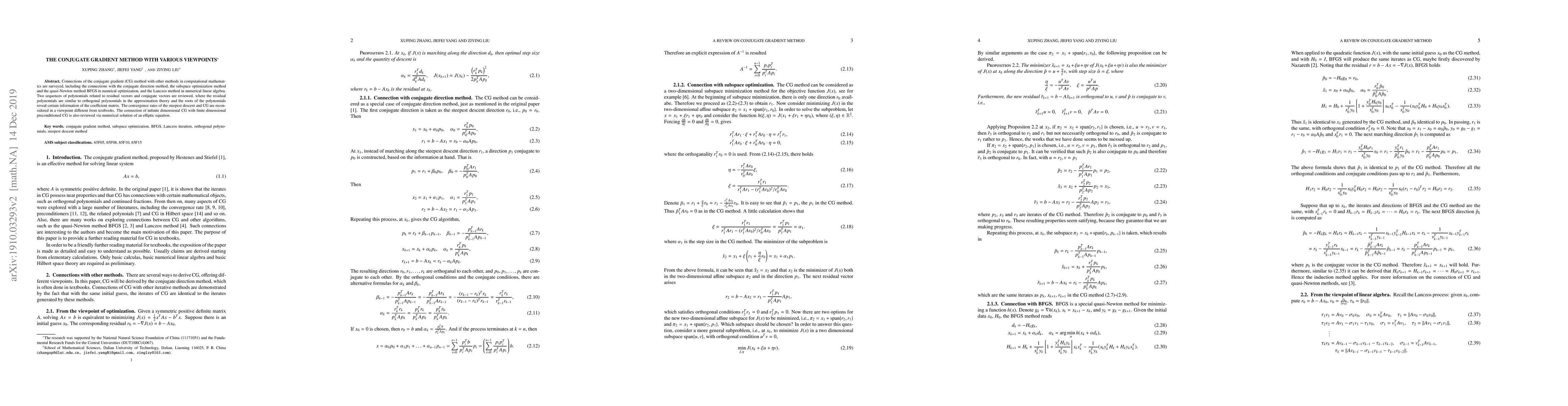 Connections of the conjugate gradient (CG) method with other methods in computational mathematics are surveyed, including the connections with the conjugate direction method, the subspace optimization method and the quasi-Newton method BFGS in numrical optimization, and the Lanczos method in numerical linear algebra. Two sequences of polynomials related to residual vectors and conjugate vectors are reviewed, where the residual polynomials are similar to orthogonal polynomials in the approximation theory and the roots of the polynomials reveal certain information of the coefficient matrix. The convergence rates of the steepest descent and CG are reconsidered in a viewpoint different from textbooks. The connection of infinite dimensional CG with finite dimensional preconditioned CG is also reviewed via numerical solution of an elliptic equation.