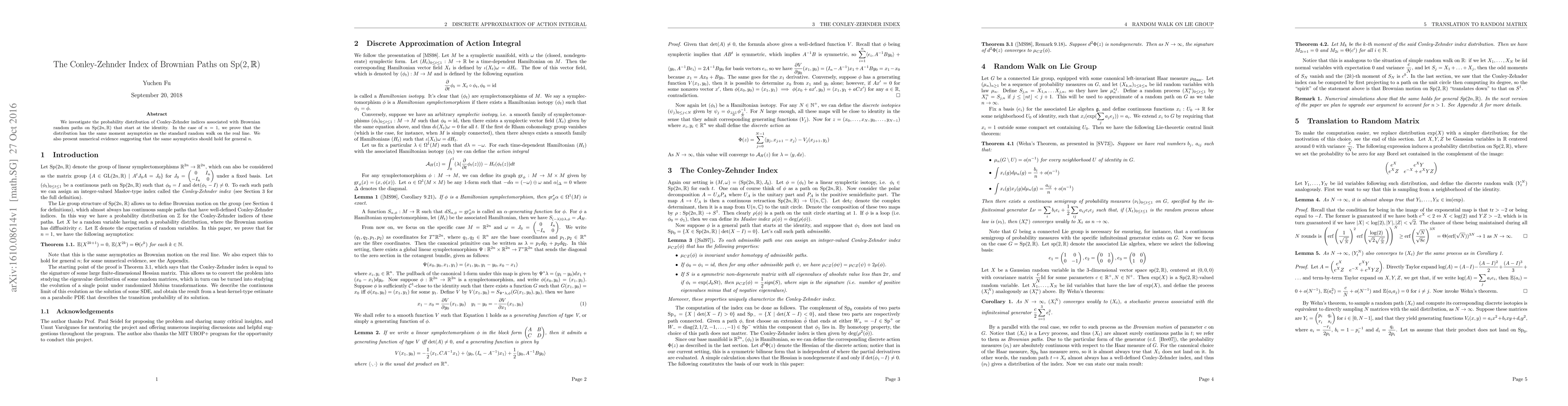 This paper studies the Conley-Zehnder index distribution for Brownian paths on Sp(2n, R) starting at the identity, proving that for n=1, it matches the moment asymptotics of a standard random walk on the real line, and providing numerical evidence suggesting this holds for all n.
