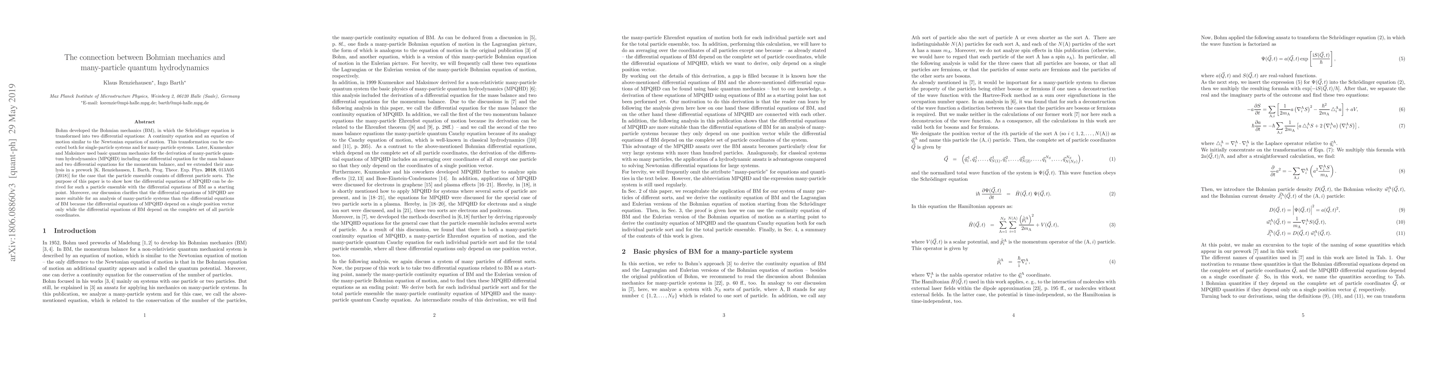 Bohm developed the Bohmian mechanics (BM), in which the Schr\"odinger equation is transformed into two differential equations: A continuity equation and an equation of motion similar to the Newtonian equation of motion. This transformation can be executed both for single-particle systems and for many-particle systems. Later, Kuzmenkov and Maksimov used basic quantum mechanics for the derivation of many-particle quantum hydrodynamics (MPQHD) including one differential equation for the mass balance and two differential equations for the momentum balance, and we extended their analysis in a prework [K. Renziehausen, I. Barth, Prog. Theor. Exp. Phys. 2018, 013A05 (2018)] for the case that the particle ensemble consists of different particle sorts. The purpose of this paper is to show how the differential equations of MPQHD can be derived for such a particle ensemble with the differential equations of BM as a starting point. Moreover, our discussion clarifies that the differential equations of MPQHD are more suitable for an analysis of many-particle systems than the differential equations of BM because the differential equations of MPQHD depend on a single position vector only while the differential equations of BM depend on the complete set of all particle coordinates.