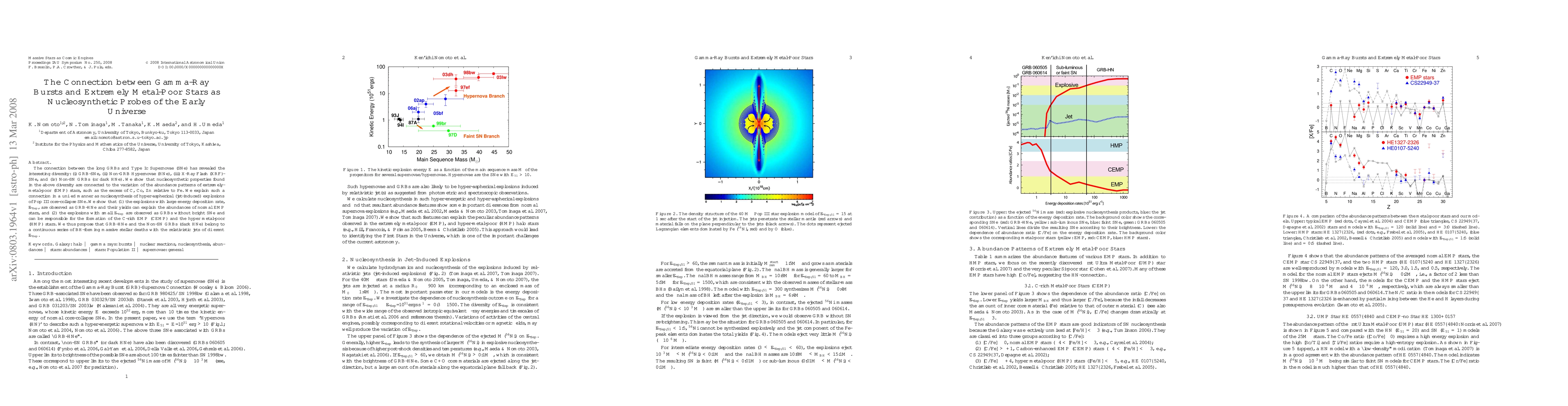 The connection between the long GRBs and Type Ic Supernovae (SNe) has revealed the interesting diversity: (i) GRB-SNe, (ii) Non-GRB Hypernovae (HNe), (iii) X-Ray Flash (XRF)-SNe, and (iv) Non-SN GRBs (or dark HNe). We show that nucleosynthetic properties found in the above diversity are connected to the variation of the abundance patterns of extremely-metal-poor (EMP) stars, such as the excess of C, Co, Zn relative to Fe. We explain such a connection in a unified manner as nucleosynthesis of hyper-aspherical (jet-induced) explosions Pop III core-collapse SNe. We show that (1) the explosions with large energy deposition rate, $\dot{E}_{\rm dep}$, are observed as GRB-HNe and their yields can explain the abundances of normal EMP stars, and (2) the explosions with small $\dot{E}_{\rm dep}$ are observed as GRBs without bright SNe and can be responsible for the formation of the C-rich EMP (CEMP) and the hyper metal-poor (HMP) stars. We thus propose that GRB-HNe and the Non-SN GRBs (dark HNe) belong to a continuous series of BH-forming stellar deaths with the relativistic jets of different $\dot{E}_{\rm dep}$.