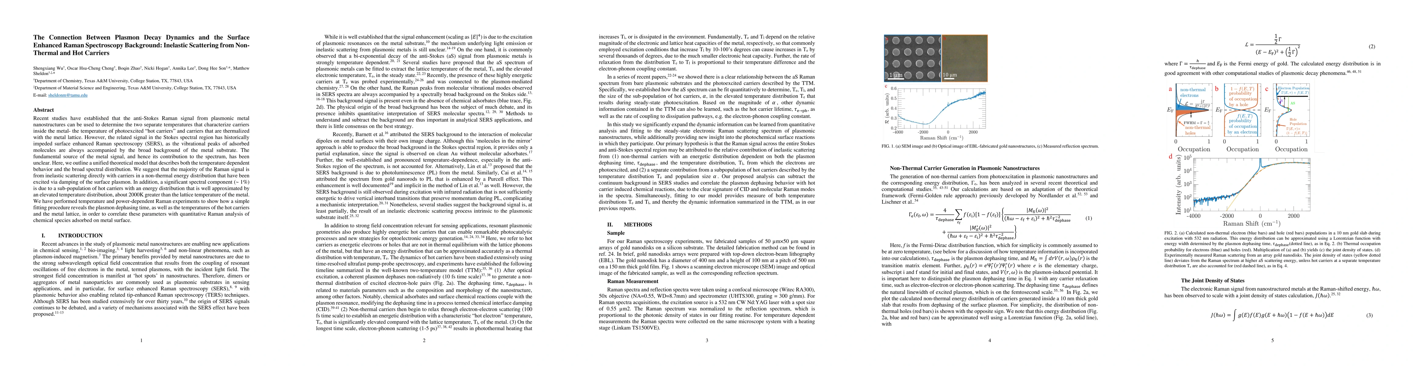 This paper presents a theoretical model explaining the source of the SERS background signal, attributing it primarily to inelastic scattering from non-thermal carriers excited by plasmon decay. It also identifies a minor contribution from hot carriers, and uses Raman experiments to correlate these findings with the plasmon dephasing time and temperatures of the metal lattice.