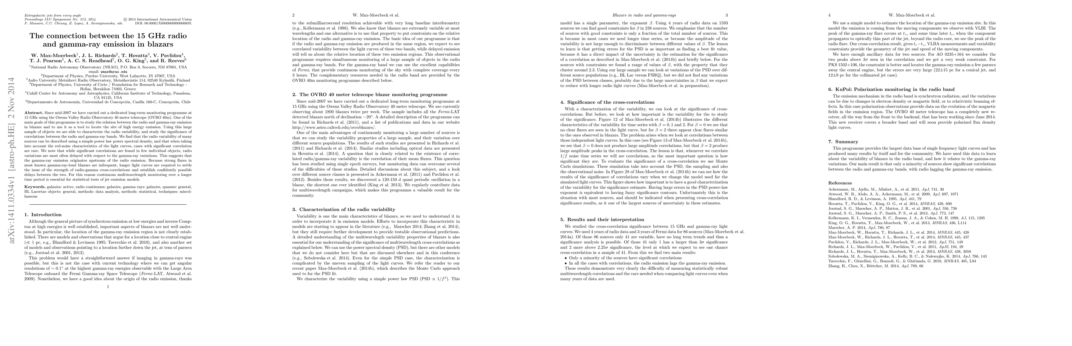 Since mid-2007 we have carried out a dedicated long-term monitoring programme at 15 GHz using the Owens Valley Radio Observatory 40 meter telescope. One of the main goals of this programme is to study the relation between the radio and gamma-ray emission in blazars and to use it as a tool to locate the site of high energy emission. Using this large sample of objects we are able to characterize the radio variability, and study the significance of correlations between the radio and gamma-ray bands. We find that the radio variability of many sources can be described using a simple power law power spectral density, and that when taking into account the red-noise characteristics of the light curves, cases with significant correlation are rare. We note that while significant correlations are found in few individual objects, radio variations are most often delayed with respect to the gamma-ray variations. This suggests that the gamma-ray emission originates upstream of the radio emission. Because strong flares in most known gamma-ray-loud blazars are infrequent, longer light curves are required to settle the issue of the strength of radio-gamma cross-correlations and establish confidently possible delays between the two. For this reason continuous multiwavelength monitoring over a longer time period is essential for statistical tests of jet emission models.