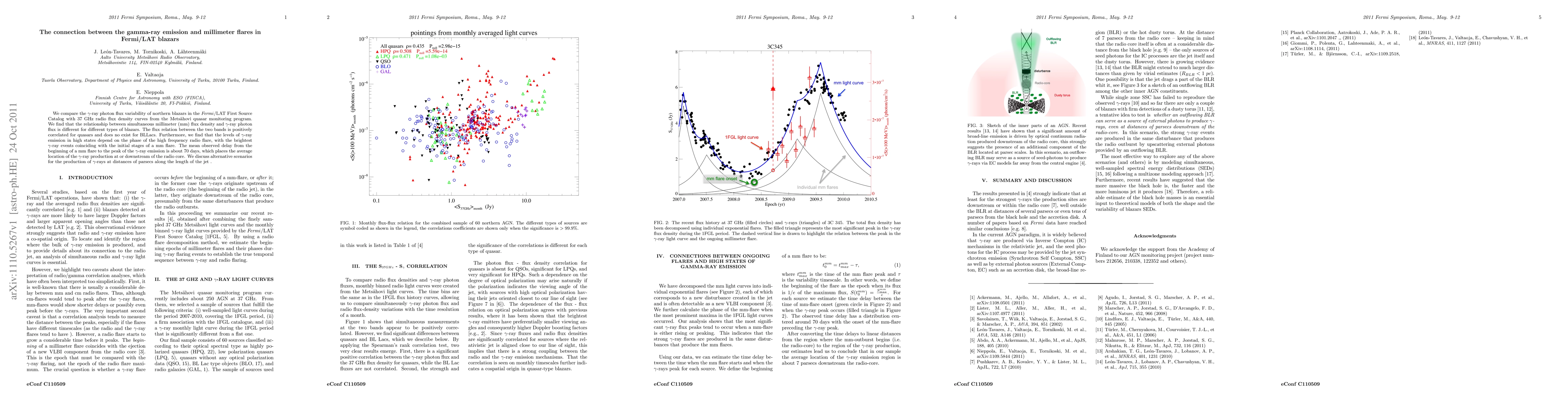 We compare the gamma-ray photon flux variability of northern blazars in the Fermi/LAT First Source Catalog with 37 GHz radio flux density curves from the Metsahovi quasar monitoring program. We find that the relationship between simultaneous millimeter (mm) flux density and gamma-ray photon flux is different for different types of blazars. The flux relation between the two bands is positively correlated for quasars and does no exist for BLLacs. Furthermore, we find that the levels of gamma-ray emission in high states depend on the phase of the high frequency radio flare, with the brightest gamma-ray events coinciding with the initial stages of a mm flare. The mean observed delay from the beginning of a mm flare to the peak of the gamma-ray emission is about 70 days, which places the average location of the gamma-ray production at or downstream of the radio core. We discuss alternative scenarios for the production of gamma-rays at distances of parsecs along the length of the jet