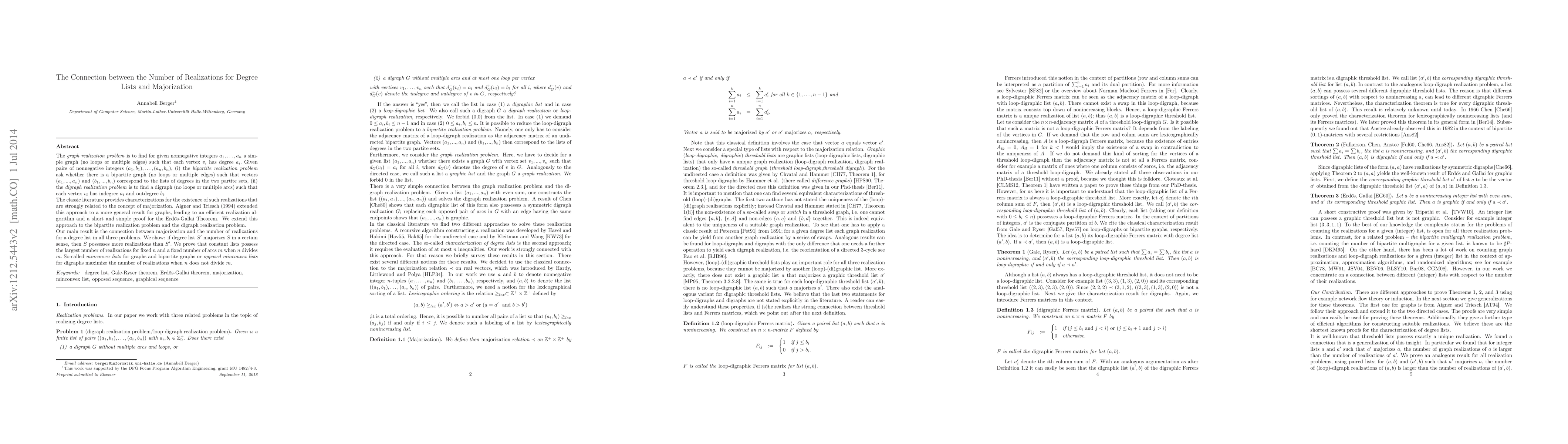 The \emph{graph realization problem} is to find for given nonnegative integers $a_1,\dots,a_n$ a simple graph (no loops or multiple edges) such that each vertex $v_i$ has degree $a_i.$ Given pairs of nonnegative integers $(a_1,b_1),\dots,(a_n,b_n),$ (i) the \emph{bipartite realization problem} ask whether there is a bipartite graph (no loops or multiple edges) such that vectors $(a_1,...,a_n)$ and $(b_1,...,b_n)$ correspond to the lists of degrees in the two partite sets, (ii) the \emph{digraph realization problem} is to find a digraph (no loops or multiple arcs) such that each vertex $v_i$ has indegree $a_i$ and outdegree $b_i.$\\ The classic literature provides characterizations for the existence of such realizations that are strongly related to the concept of majorization. Aigner and Triesch (1994) extended this approach to a more general result for graphs, leading to an efficient realization algorithm and a short and simple proof for the Erd\H{o}s-Gallai Theorem. We extend this approach to the bipartite realization problem and the digraph realization problem.\\ Our main result is the connection between majorization and the number of realizations for a degree list in all three problems. We show: if degree list $S'$ majorizes $S$ in a certain sense, then $S$ possesses more realizations than $S'.$ We prove that constant lists possess the largest number of realizations for fixed $n$ and a fixed number of arcs $m$ when $n$ divides $m.$ So-called \emph{minconvex lists} for graphs and bipartite graphs or \emph{opposed minconvex lists} for digraphs maximize the number of realizations when $n$ does not divide $m$.