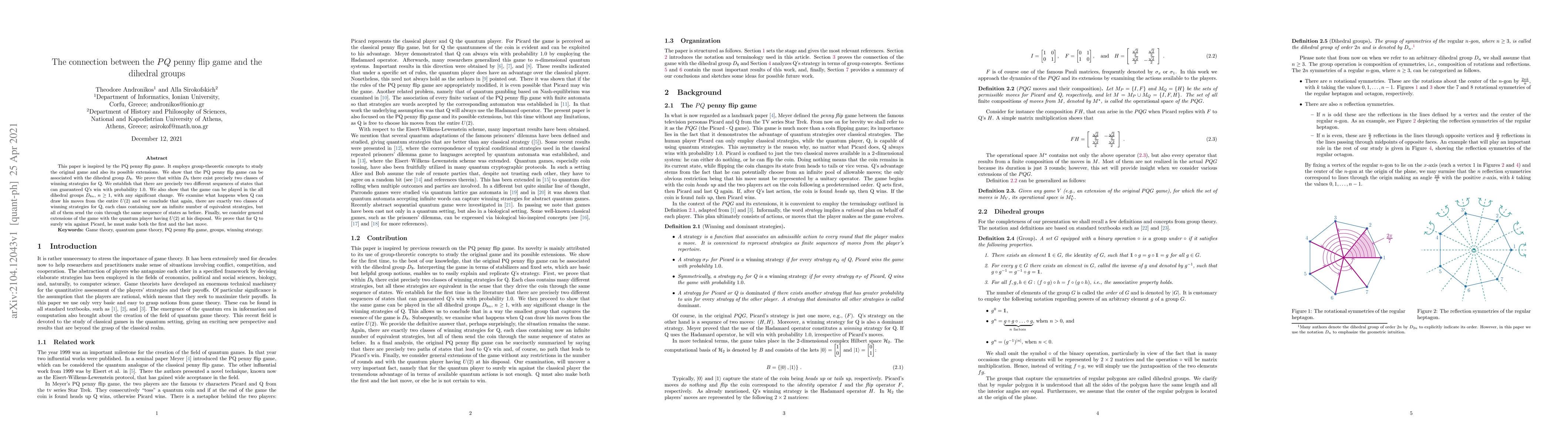 This paper is inspired by the PQ penny flip game. It employs group-theoretic concepts to study the original game and also its possible extensions. We show that the PQ penny flip game can be associated with the dihedral group $D_{8}$. We prove that within $D_{8}$ there exist precisely two classes of winning strategies for Q. We establish that there are precisely two different sequences of states that can guaranteed Q's win with probability $1.0$. We also show that the game can be played in the all dihedral groups $D_{8 n}$, $n \geq 1$, with any significant change. We examine what happens when Q can draw his moves from the entire $U(2)$ and we conclude that again, there are exactly two classes of winning strategies for Q, each class containing now an infinite number of equivalent strategies, but all of them send the coin through the same sequence of states as before. Finally, we consider general extensions of the game with the quantum player having $U(2)$ at his disposal. We prove that for Q to surely win against Picard, he must make both the first and the last move.