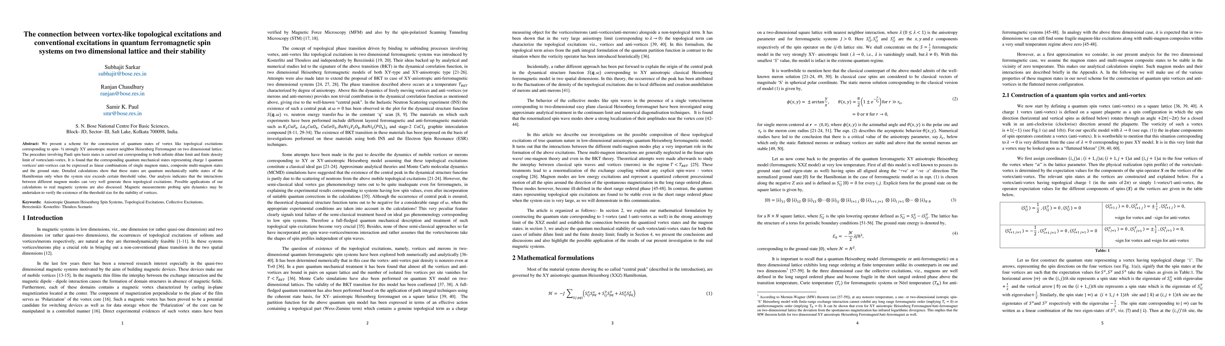 This paper constructs quantum states for vortex-like topological excitations in a two-dimensional quantum ferromagnetic spin system, showing they are stable when the system size exceeds a certain threshold. The stability is linked to interactions between magnon modes, with potential applications to real magnetic systems.