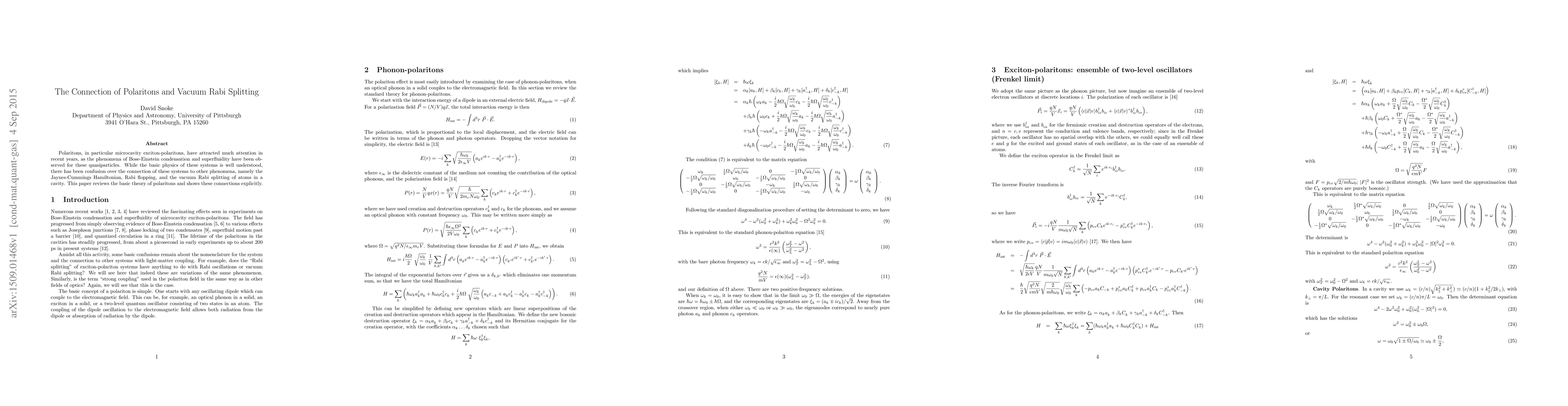 The paper reviews the basic theory of polaritons, explicitly connecting them to the Jaynes-Cummings Hamiltonian, Rabi flopping, and vacuum Rabi splitting of atoms in a cavity.