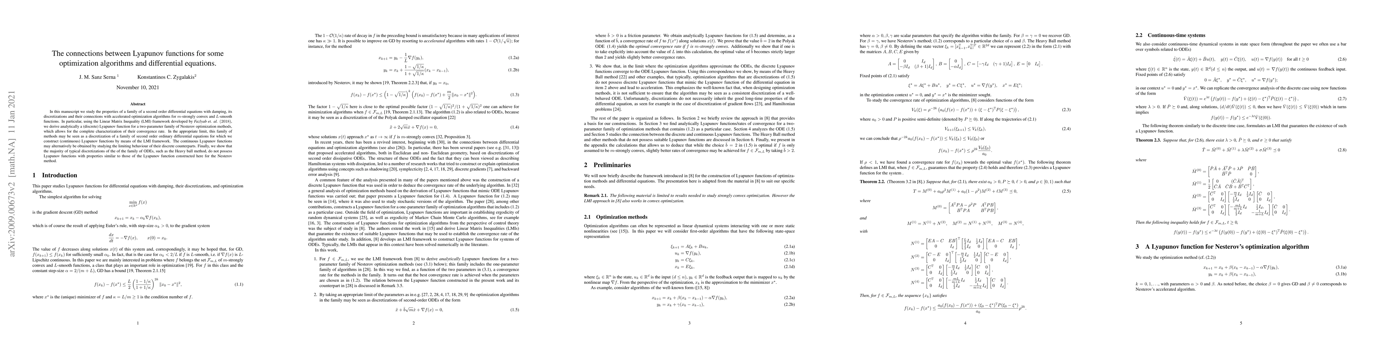 This paper investigates the connections between second-order differential equations with damping and accelerated optimization algorithms, deriving (discrete) Lyapunov functions for Nesterov methods and constructing continuous Lyapunov functions via the LMI framework. It reveals that typical discretizations of ODEs like the Heavy ball method lack similar Lyapunov properties.