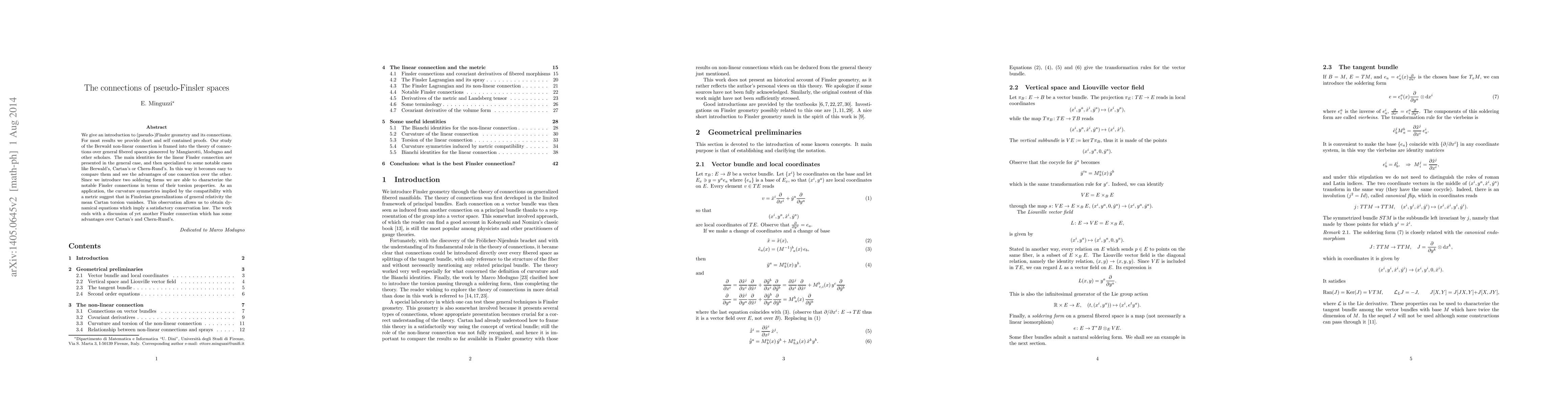 This paper explores connections in pseudo-Finsler spaces, providing proofs for main identities and characterizing notable connections through torsion properties. It also offers implications for Finslerian generalizations of general relativity, including a conservation law and a new connection with advantages over existing ones.