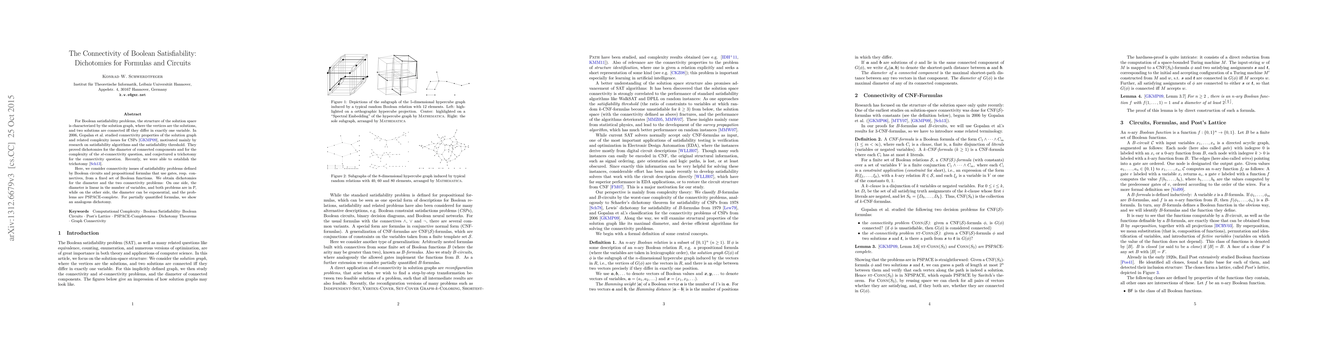 This paper establishes dichotomies for connectivity properties in Boolean satisfiability problems, distinguishing cases where solution graph diameter is linear and problems are in P, from cases where the diameter is exponential and problems are PSPACE-complete. It confirms a conjectured trichotomy and extends findings to Boolean circuits and partially quantified formulas.