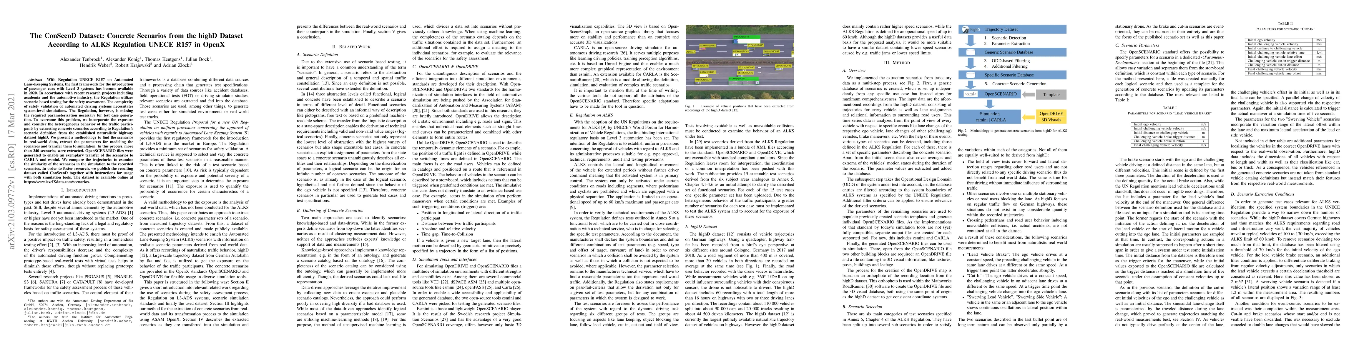 With Regulation UNECE R157 on Automated Lane-Keeping Systems, the first framework for the introduction of passenger cars with Level 3 systems has become available in 2020. In accordance with recent research projects including academia and the automotive industry, the Regulation utilizes scenario based testing for the safety assessment. The complexity of safety validation of automated driving systems necessitates system-level simulations. The Regulation, however, is missing the required parameterization necessary for test case generation. To overcome this problem, we incorporate the exposure and consider the heterogeneous behavior of the traffic participants by extracting concrete scenarios according to Regulation's scenario definition from the established naturalistic highway dataset highD. We present a methodology to find the scenarios in real-world data, extract the parameters for modeling the scenarios and transfer them to simulation. In this process, more than 340 scenarios were extracted. OpenSCENARIO files were generated to enable an exemplary transfer of the scenarios to CARLA and esmini. We compare the trajectories to examine the similarity of the scenarios in the simulation to the recorded scenarios. In order to foster research, we publish the resulting dataset called ConScenD together with instructions for usage with both simulation tools. The dataset is available online at https://www.levelXdata.com/scenarios.