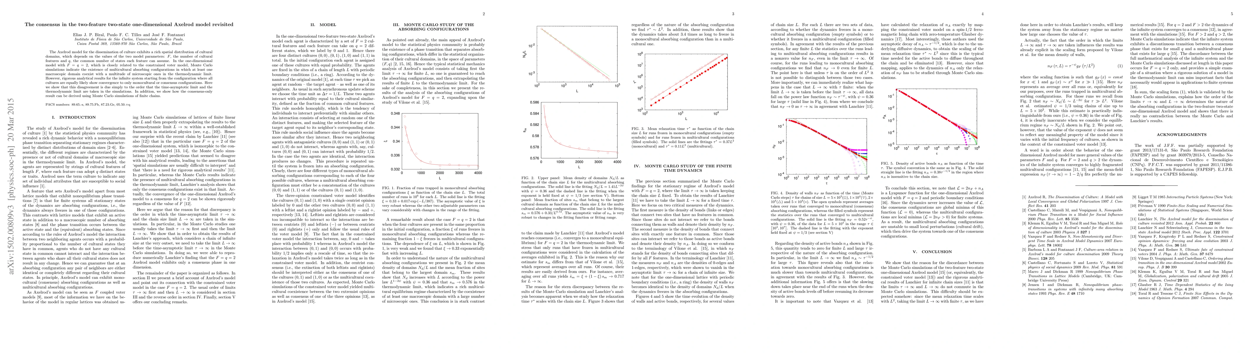 This paper revisits the one-dimensional Axelrod model with two features and two states, revealing that Monte Carlo simulations previously suggested multicultural absorbing configurations, while analytical results indicated consensus. The study resolves this discrepancy by demonstrating that the disagreement arises from the order in which limits are taken in simulations, and it shows consensus can be derived using finite chain simulations.