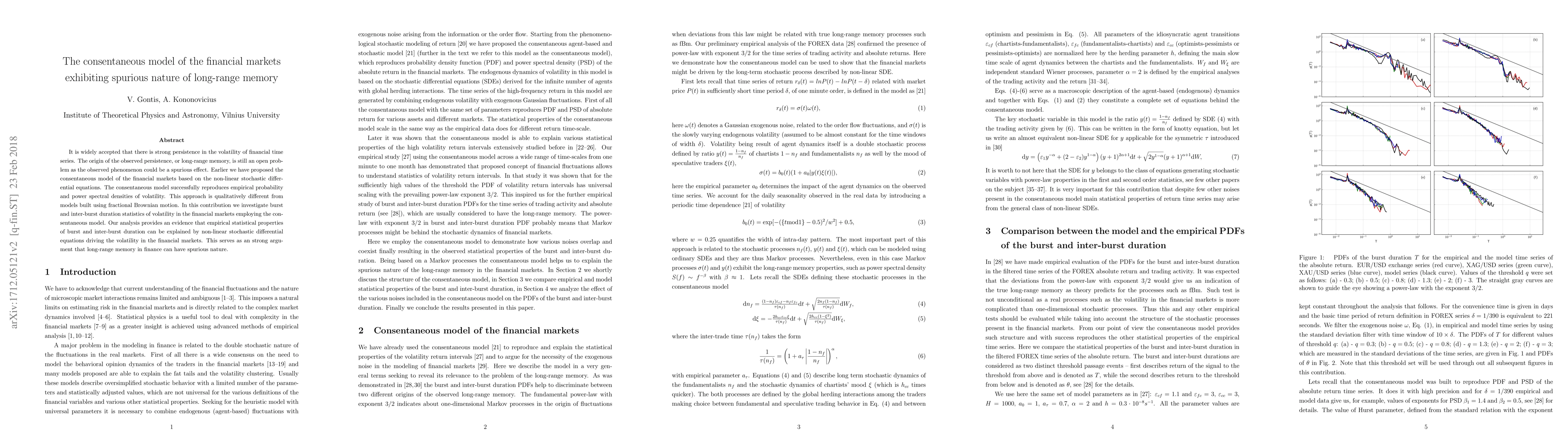 The research proposes a consensual model based on non-linear stochastic differential equations to replicate financial market volatility, suggesting that long-range memory observed in financial time series may be spurious rather than genuine. The study finds that the model can explain empirical statistical properties, supporting the idea that long-range memory is not inherent but rather a spurious effect.