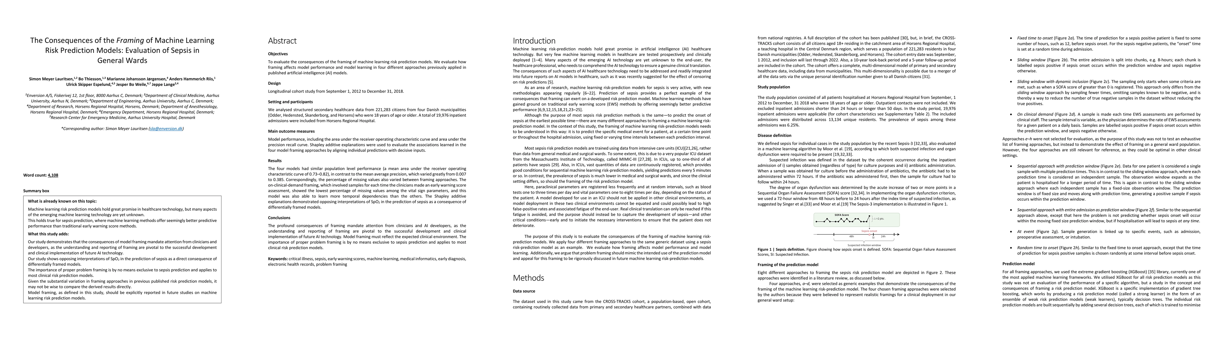 Objectives: To evaluate the consequences of the framing of machine learning risk prediction models. We evaluate how framing affects model performance and model learning in four different approaches previously applied in published artificial-intelligence (AI) models. Setting and participants: We analysed structured secondary healthcare data from 221,283 citizens from four Danish municipalities who were 18 years of age or older. Results: The four models had similar population level performance (a mean area under the receiver operating characteristic curve of 0.73 to 0.82), in contrast to the mean average precision, which varied greatly from 0.007 to 0.385. Correspondingly, the percentage of missing values also varied between framing approaches. The on-clinical-demand framing, which involved samples for each time the clinicians made an early warning score assessment, showed the lowest percentage of missing values among the vital sign parameters, and this model was also able to learn more temporal dependencies than the others. The Shapley additive explanations demonstrated opposing interpretations of SpO2 in the prediction of sepsis as a consequence of differentially framed models. Conclusions: The profound consequences of framing mandate attention from clinicians and AI developers, as the understanding and reporting of framing are pivotal to the successful development and clinical implementation of future AI technology. Model framing must reflect the expected clinical environment. The importance of proper problem framing is by no means exclusive to sepsis prediction and applies to most clinical risk prediction models.
