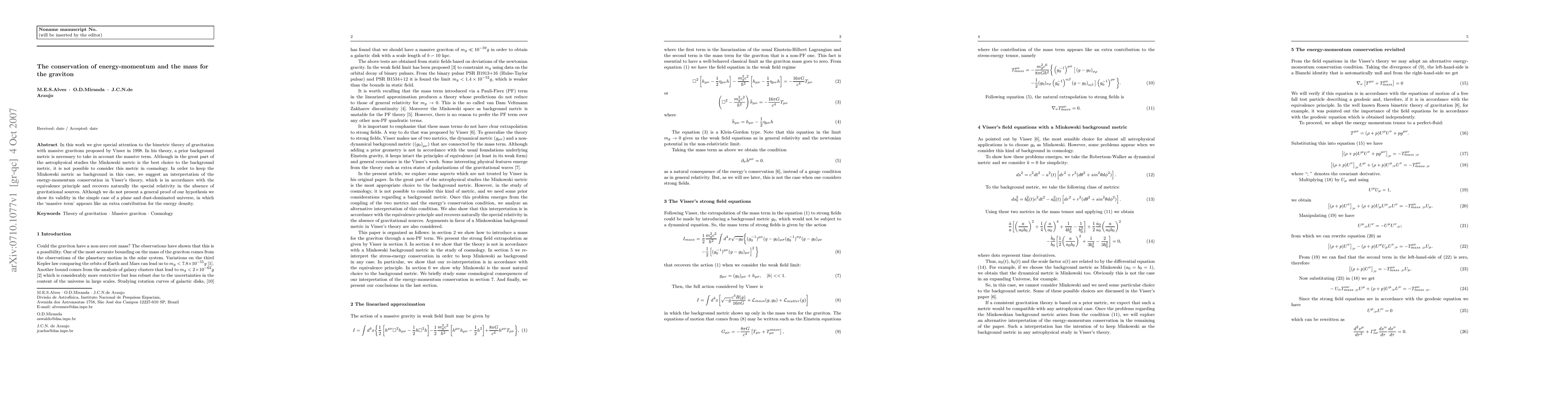 In this work we give special attention to the bimetric theory of gravitation with massive gravitons proposed by Visser in 1998. In his theory, a prior background metric is necessary to take in account the massive term. Although in the great part of the astrophysical studies the Minkowski metric is the best choice to the background metric, it is not possible to consider this metric in cosmology. In order to keep the Minkowski metric as background in this case, we suggest an interpretation of the energy-momentum conservation in Visser's theory, which is in accordance with the equivalence principle and recovers naturally the special relativity in the absence of gravitational sources. Although we do not present a general proof of our hypothesis we show its validity in the simple case of a plane and dust-dominated universe, in which the `massive term' appears like an extra contribution for the energy density.