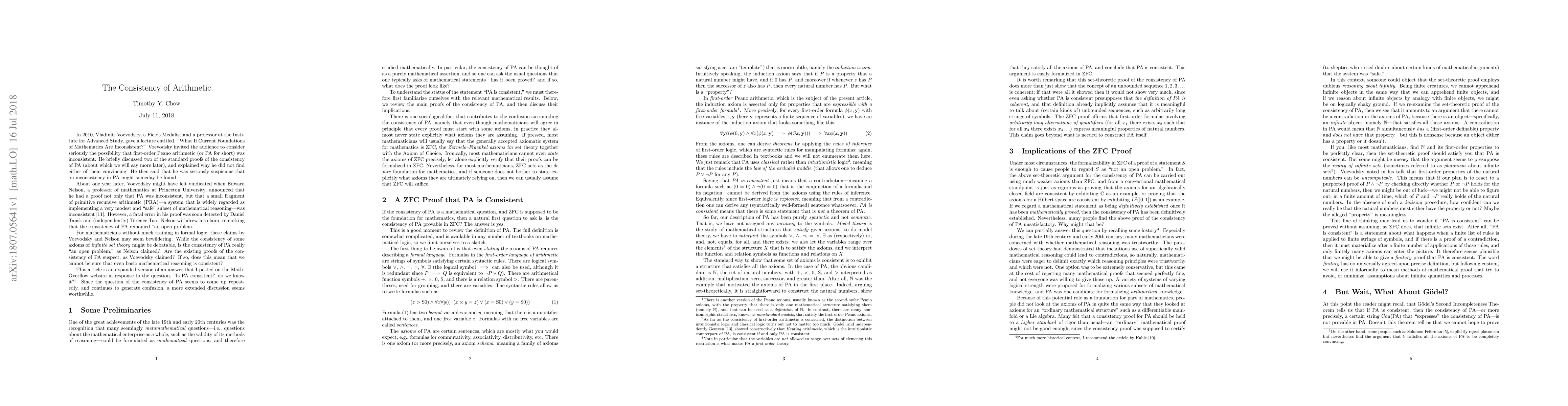 In 2010, Vladimir Voevodsky gave a lecture on "What If Current Foundations of Mathematics Are Inconsistent?" Among other things he said that he was seriously suspicious that an inconsistency in PA (first-order Peano arithmetic) might someday be found. About a year later, Edward Nelson announced that he had discovered an inconsistency not just in PA, but in a small fragment of primitive recursive arithmetic. Soon, Daniel Tausk and Terence Tao independently found a fatal error, and Nelson withdrew his claim, stating that consistency of PA was an "open problem." Many mathematicians may find such claims bewildering. Is the consistency of PA really an open problem? If so, would the discovery of an inconsistency in PA cause all of mathematics to come crashing down like a house of cards? This expository article attempts to address these questions, by sketching and discussing existing proofs of the consistency of PA (including Gentzen's proof and Friedman's relative consistency proof that appeals to the Bolzano-Weierstrass theorem). Since Nelson was a self-avowed formalist, the article also examines the implications of formalism.