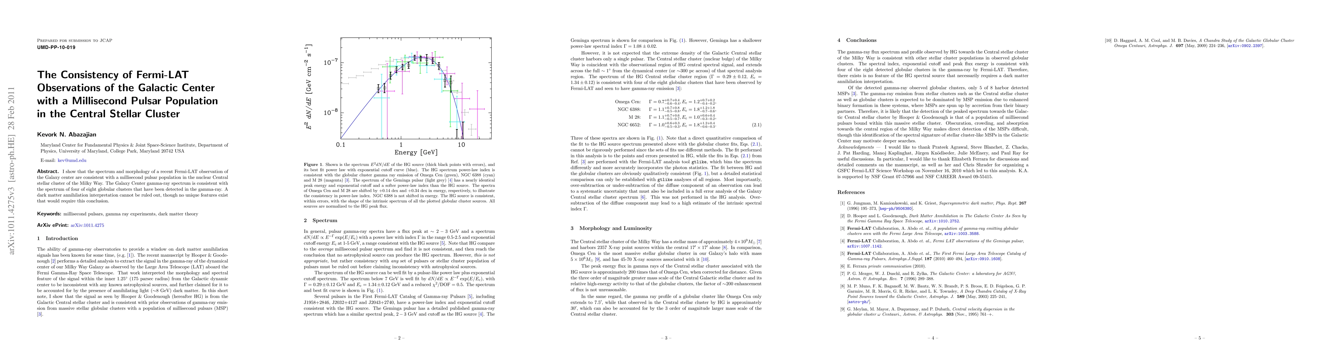 The Fermi-LAT observations of the Galactic Center's gamma-ray spectrum and morphology align with a population of millisecond pulsars in the central stellar cluster, though a dark matter annihilation interpretation remains a possibility. No unique features favor one explanation over the other.
