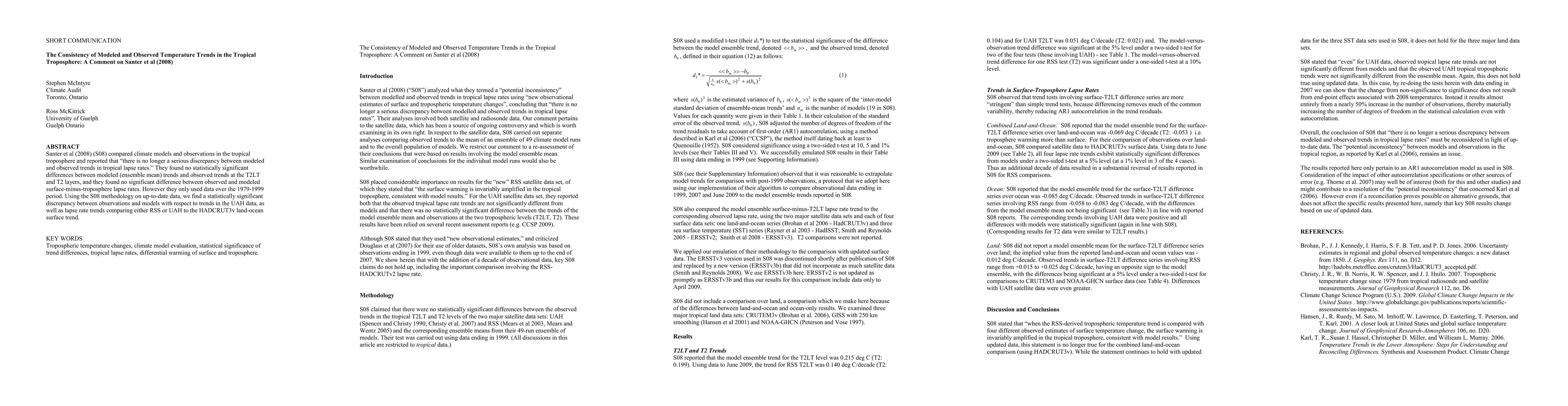 Santer et al (2008) (S08) compared climate models and observations in the tropical troposphere and reported that "there is no longer a serious discrepancy between modeled and observed trends in tropical lapse rates." They found no statistically significant differences between modeled (ensemble mean) trends and observed trends at the T2LT and T2 layers, and they found no significant difference between observed and modeled surface-minus-troposphere lapse rates. However they only used data over the 1979-1999 period. Using the S08 methodology on up-to-date data, we find a statistically significant discrepancy between observations and models with respect to trends in the UAH data, as well as lapse rate trends comparing either RSS or UAH to the HADCRUT3v land-ocean surface trend.