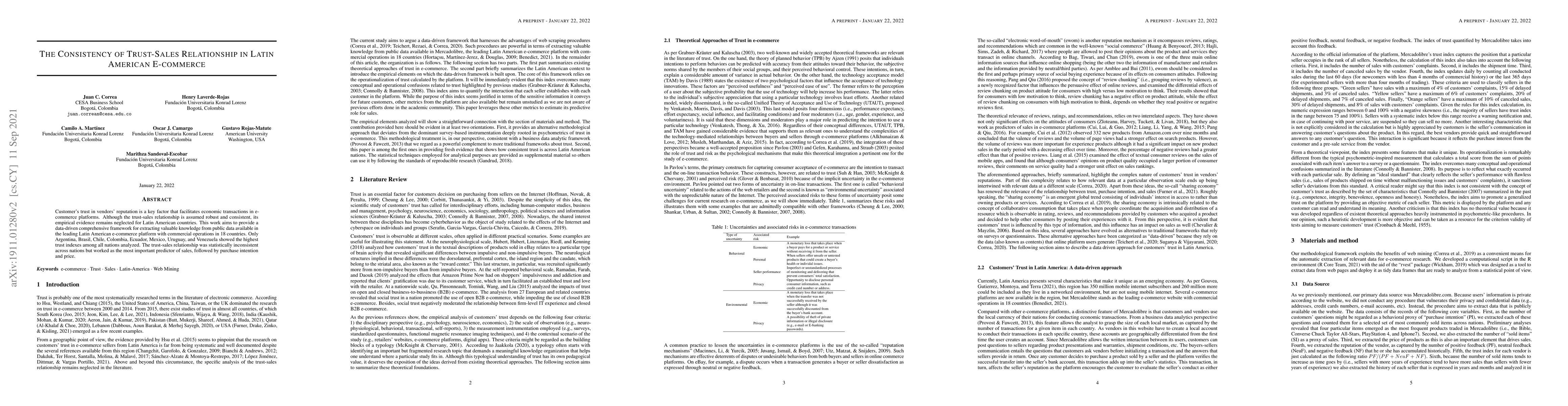 This study investigates the trust-sales relationship in Latin American e-commerce, finding that while trust is a crucial predictor of sales, its impact varies significantly across countries. The analysis highlights Argentina, Brazil, Chile, Colombia, Ecuador, Mexico, Uruguay, and Venezuela as nations with the highest trust indexes.